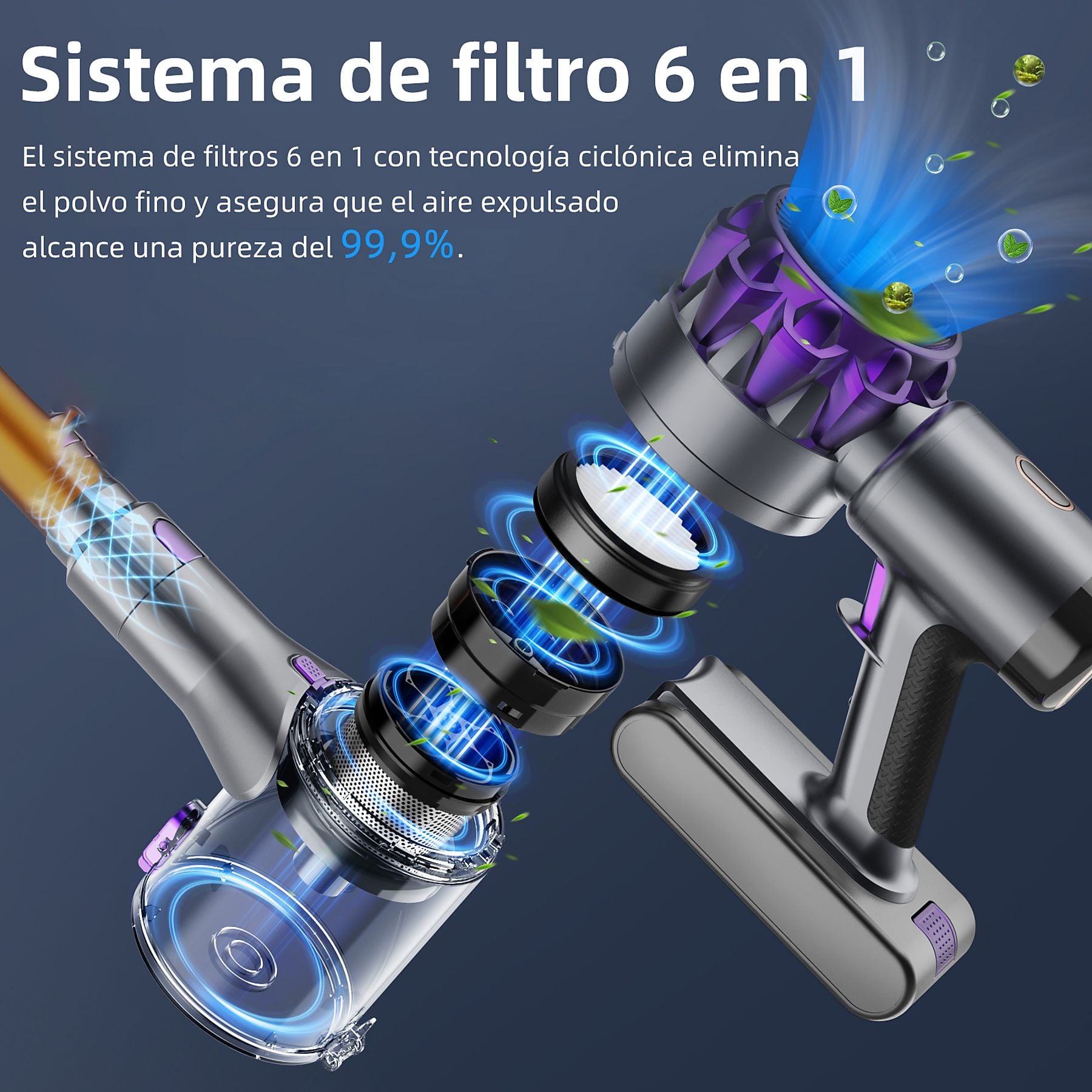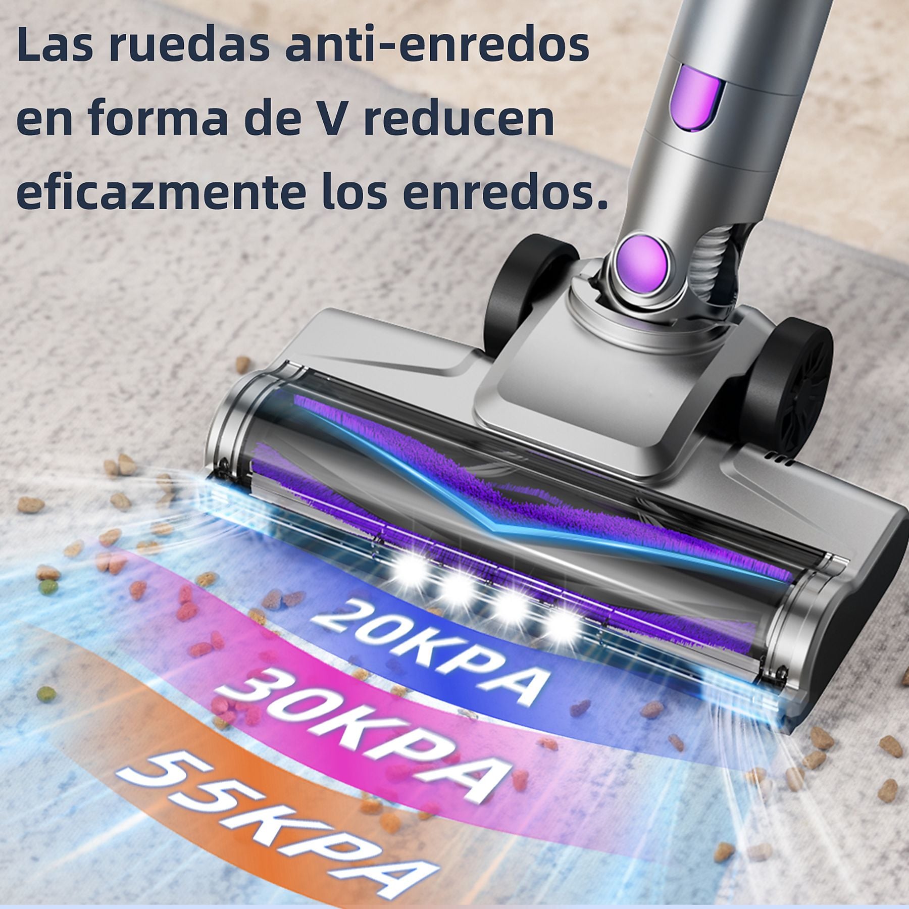 Aspiradora inalámbrica de alto rendimiento con una potencia de succión líder de 55 kPa y sistema de filtrado de 6 etapas. Su diseño ergonómico con tubo telescópico y cepillo antienredos en V la convierten en la aliada perfecta para hogares con mascotas.