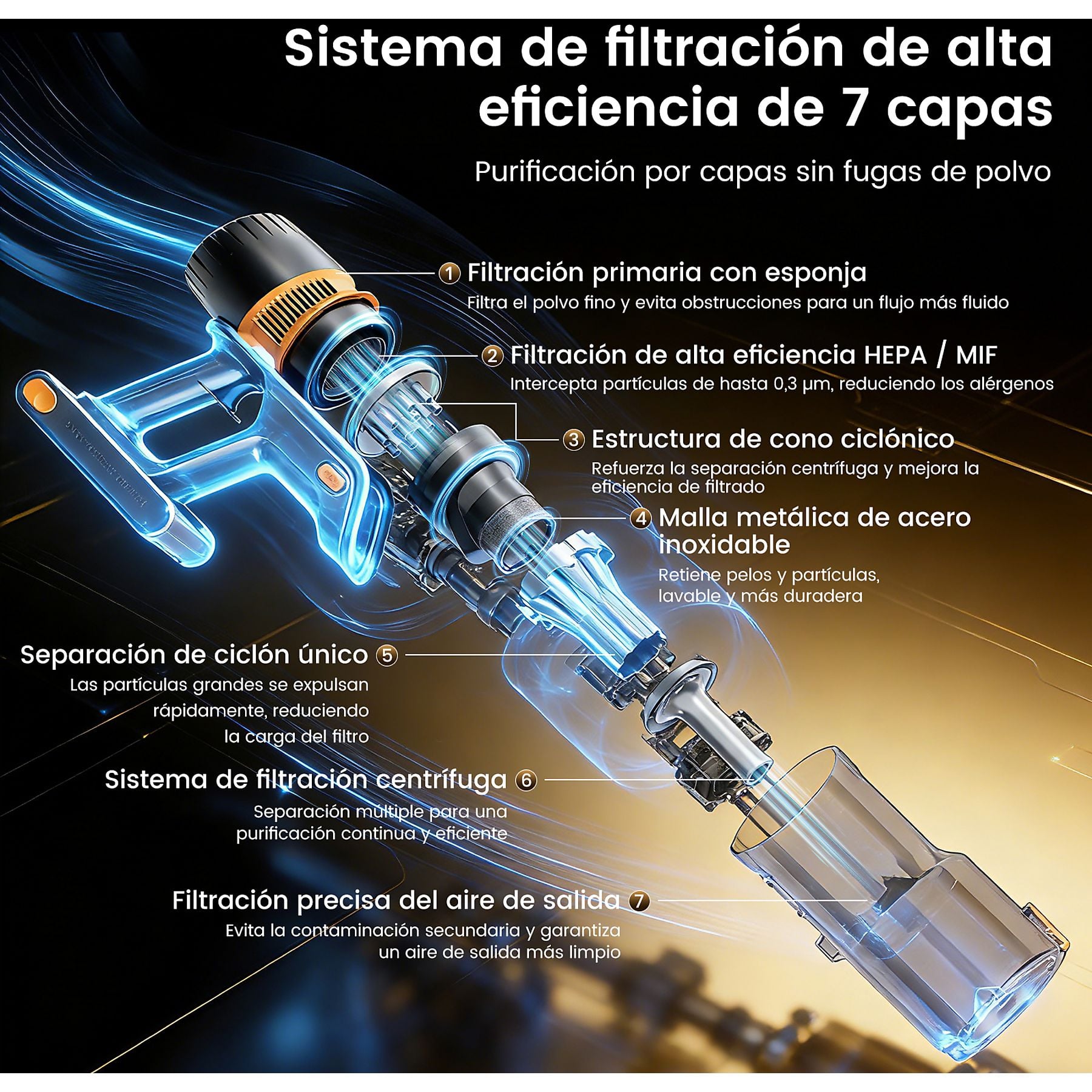 Sistema de Filtración: 7 etapas con filtro HEPA (captura el 99,99% de alérgenos).