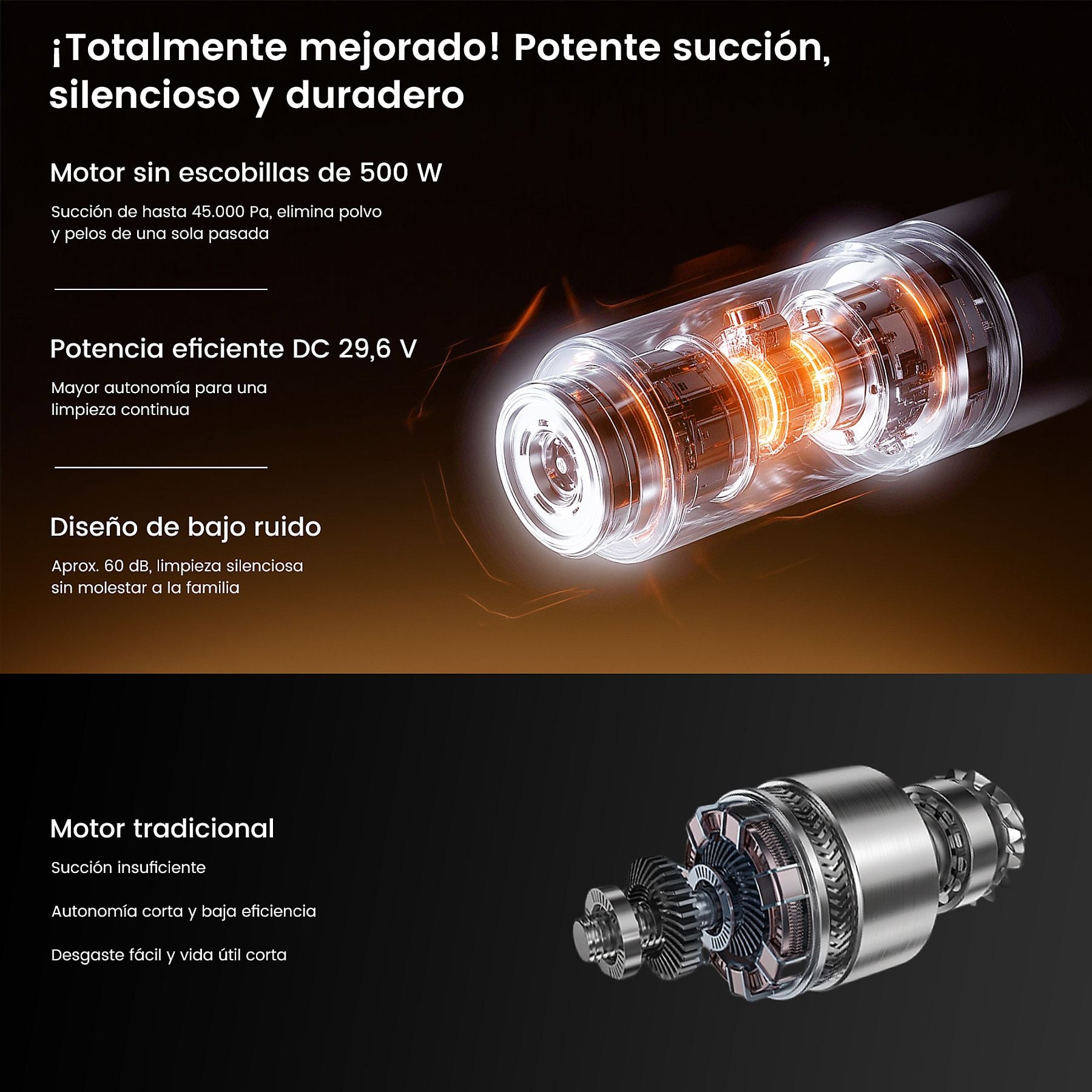 Aspirador inalámbrico de alto rendimiento con una potencia de succión líder de 45 kPa y sistema de filtración de 7 etapas. Incluye luz LED verde para revelar el polvo invisible y un cepillo antienredos en forma de V, ideal para todo tipo de superficies.
