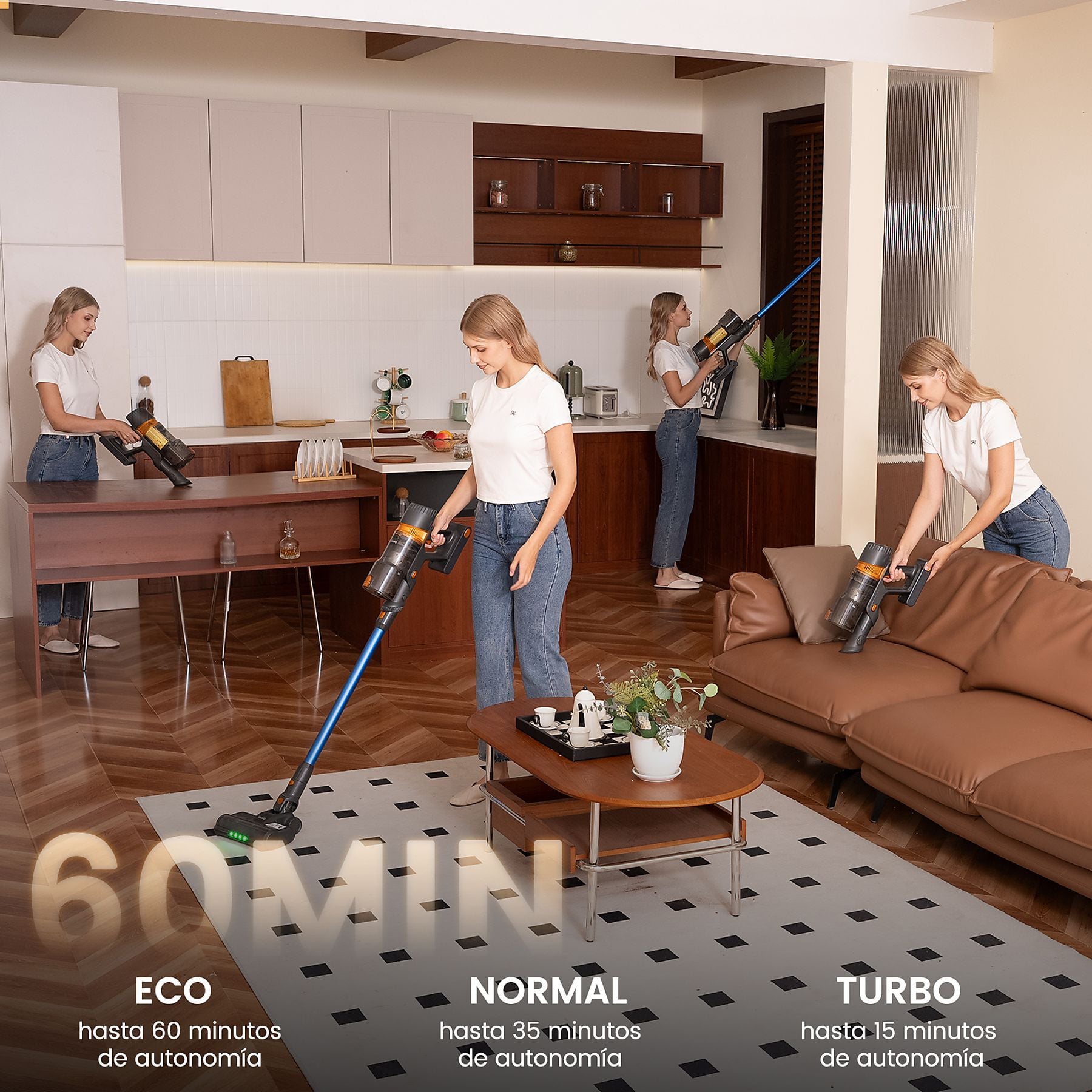 Aspirador escoba sin cable – VACNIQ V3 | 45 kPa, Autonomía 60 min, Luz verde detecta-polvo y Pantalla LED Azul