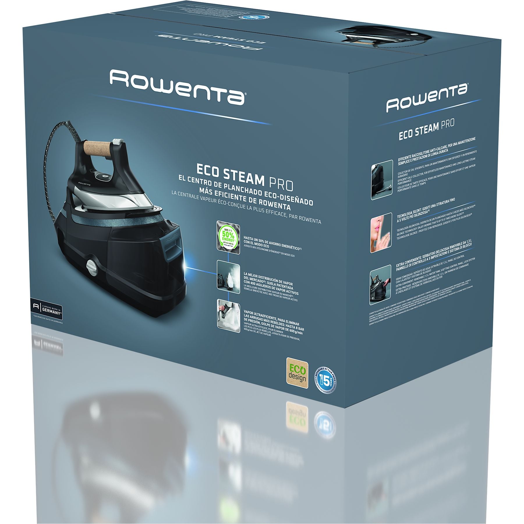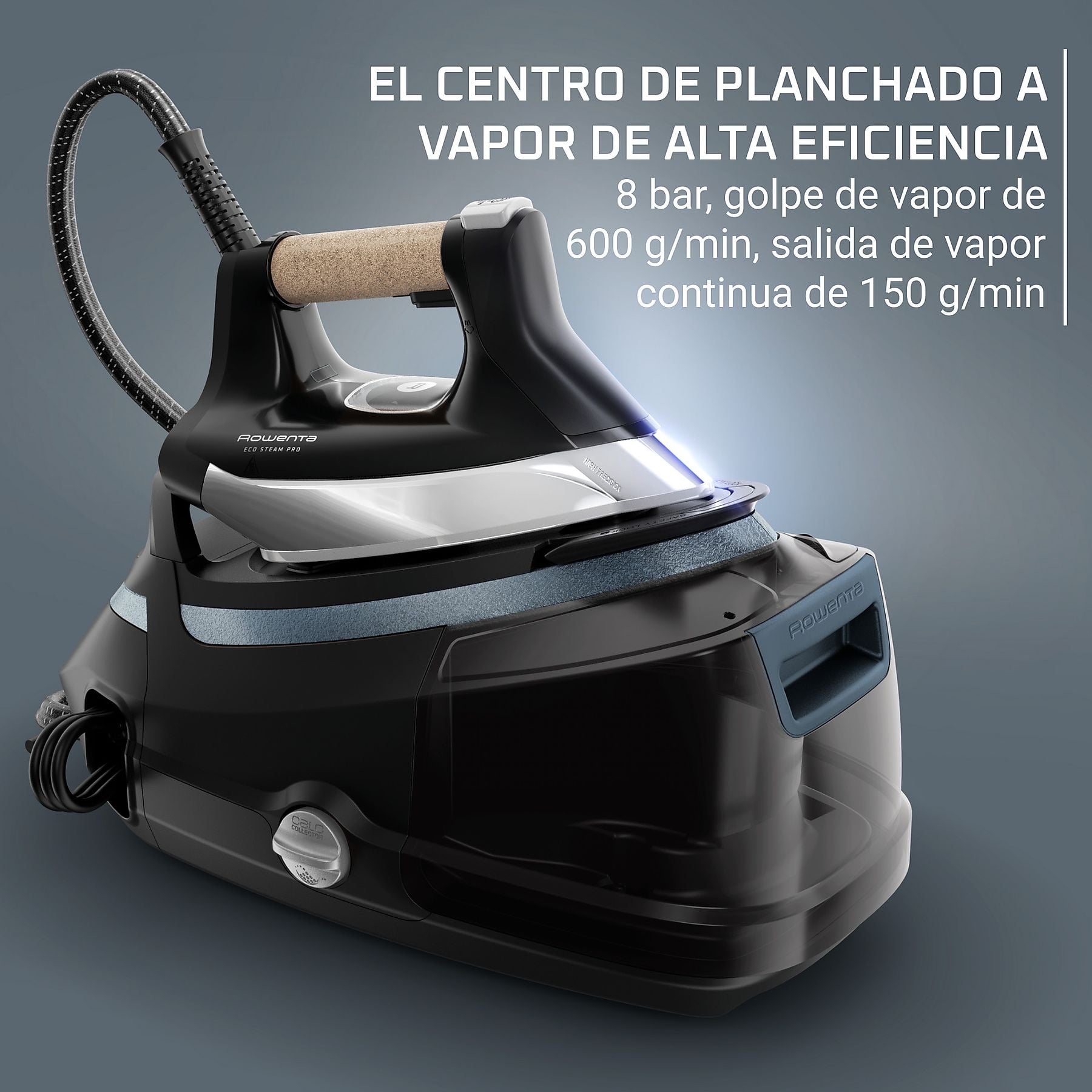 El centro de planchado más eficiente y ecológico de Rowenta, con 8 bares de presión y un modo Eco que reduce el consumo energético un 50%. Fabricado con materiales reciclados, ofrece un planchado profesional 5 veces más silencioso.