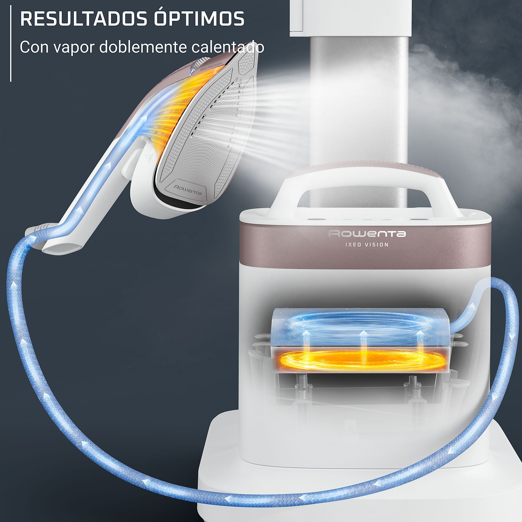 Rowenta IXEO Vision revoluciona el cuidado de la ropa al fusionar una plancha de alta presión con un vaporizador vertical de mano. Su innovadora Smart Board (tabla inteligente) se ajusta en tres posiciones (vertical, horizontal e inclinada a 30°) con una sola mano, permitiéndote pasar de un retoque rápido de última hora a un planchado intensivo sin cambiar de equipo.