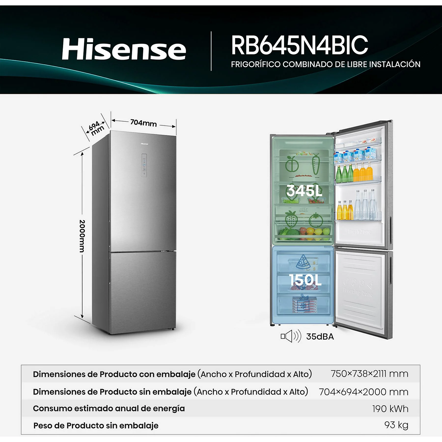 El Hisense RB645N4BIC es la elección perfecta para quienes buscan el espacio de un frigorífico de gran formato sin renunciar a la estética de un combi moderno. Con sus 70 cm de ancho y 2 metros de altura, ofrece una capacidad masiva de 495 litros, combinando tecnologías de refrigeración avanzadas con un diseño en acero inoxidable que se convierte en el centro de atención de la cocina.