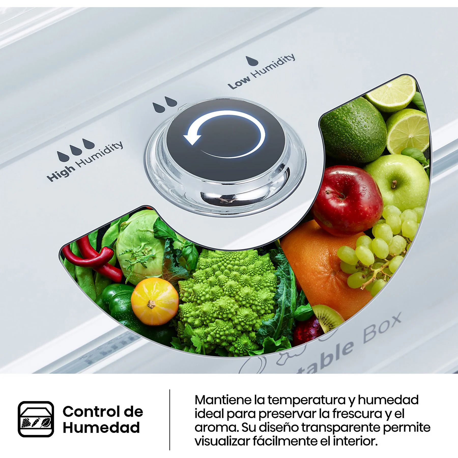 • Cajón de Frutas y Verduras: Un espacio diseñado para regular la humedad y temperatura, asegurando que tus vegetales conserven su hidratación, textura y aroma como el primer día.