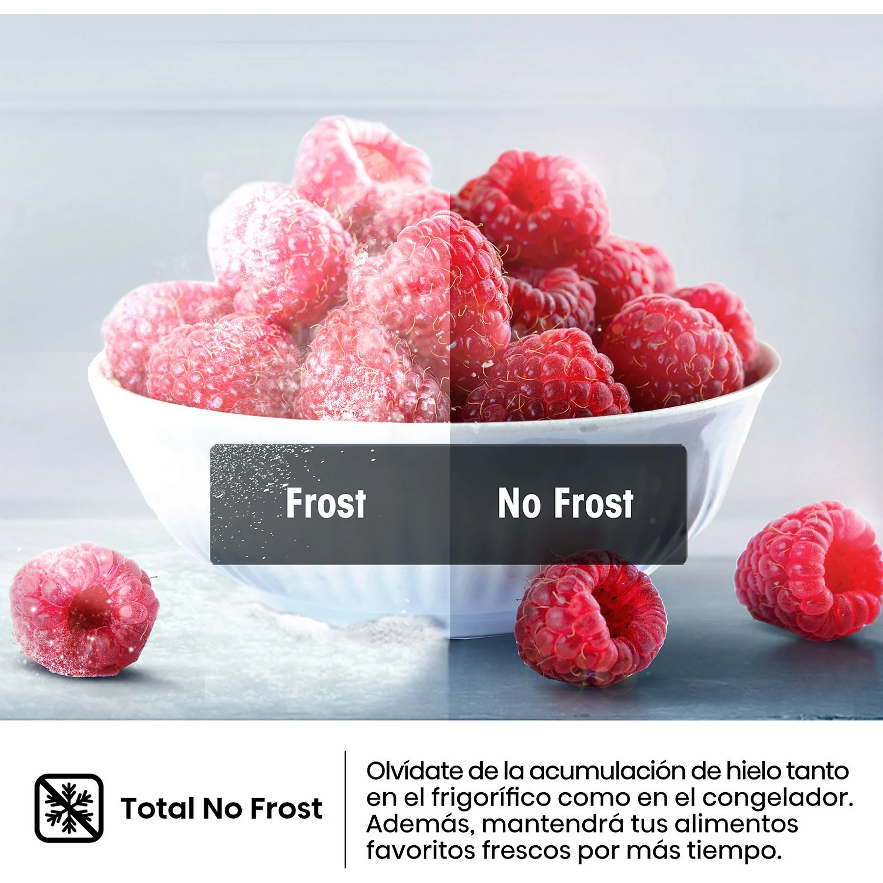 • Total No Frost: Olvídate de la escarcha para siempre. Este sistema evita la acumulación de hielo en paredes y cajones, manteniendo los alimentos frescos por más tiempo y eliminando la necesidad de descongelar manualmente.