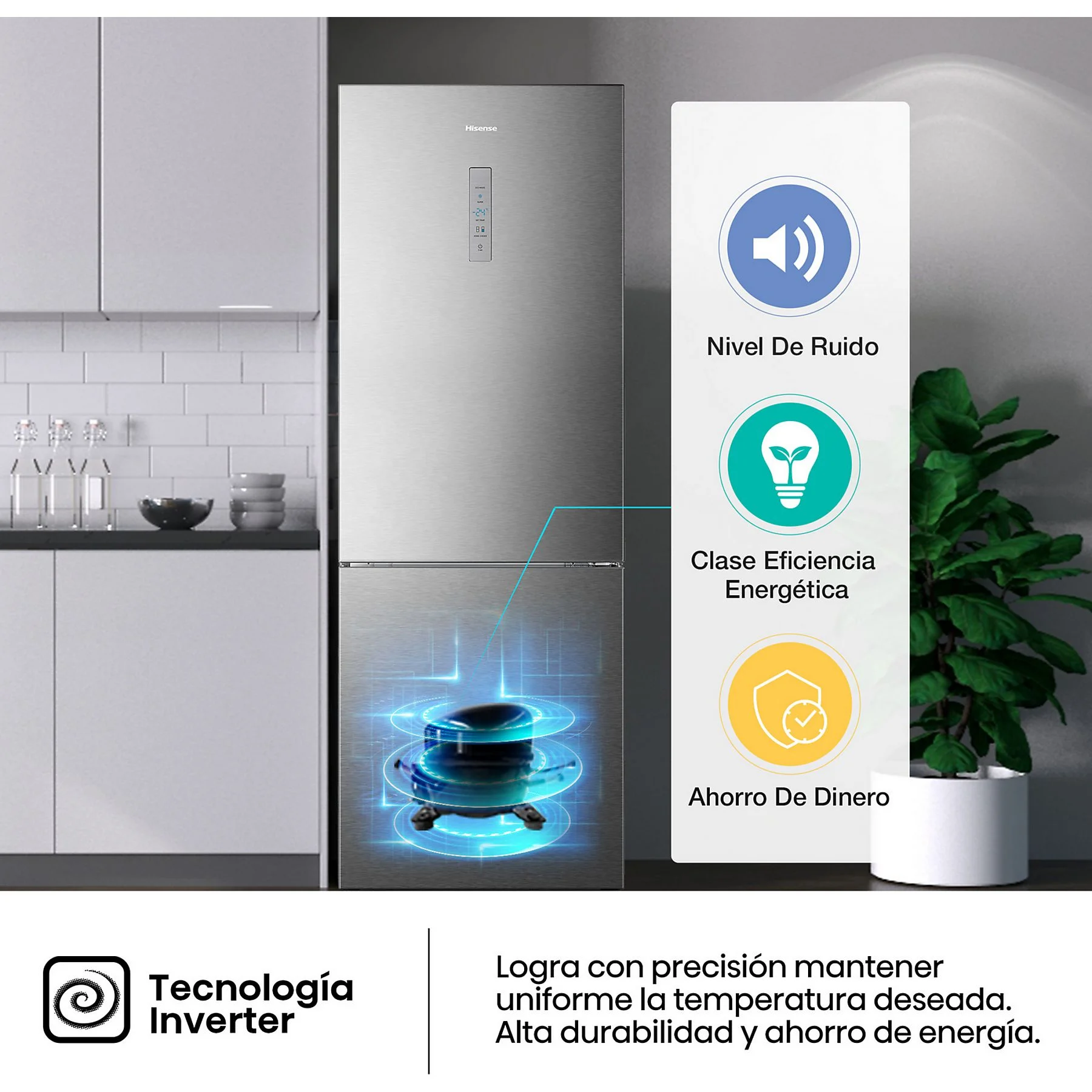 • Motor Inverter: Un compresor de alta eficiencia que ajusta su potencia de forma precisa. El resultado es un funcionamiento extremadamente silencioso, una mayor durabilidad y un ahorro de energía constante.