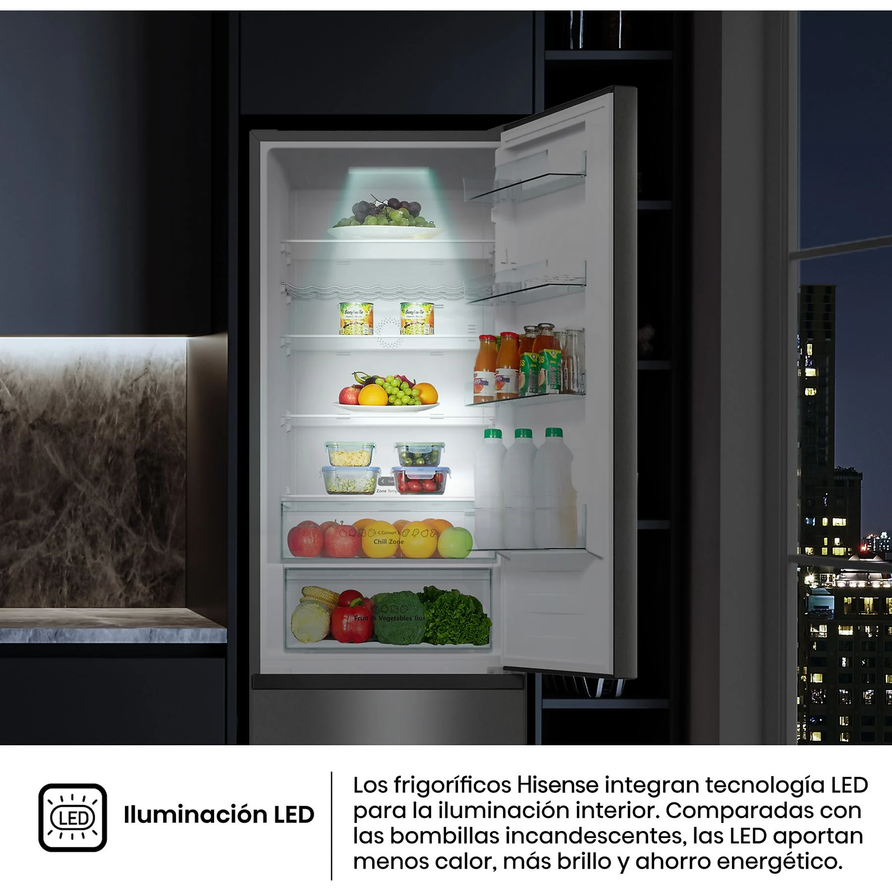 • Iluminación LED: Luz brillante y eficiente que permite visualizar todo el contenido de un vistazo sin generar calor interior.
