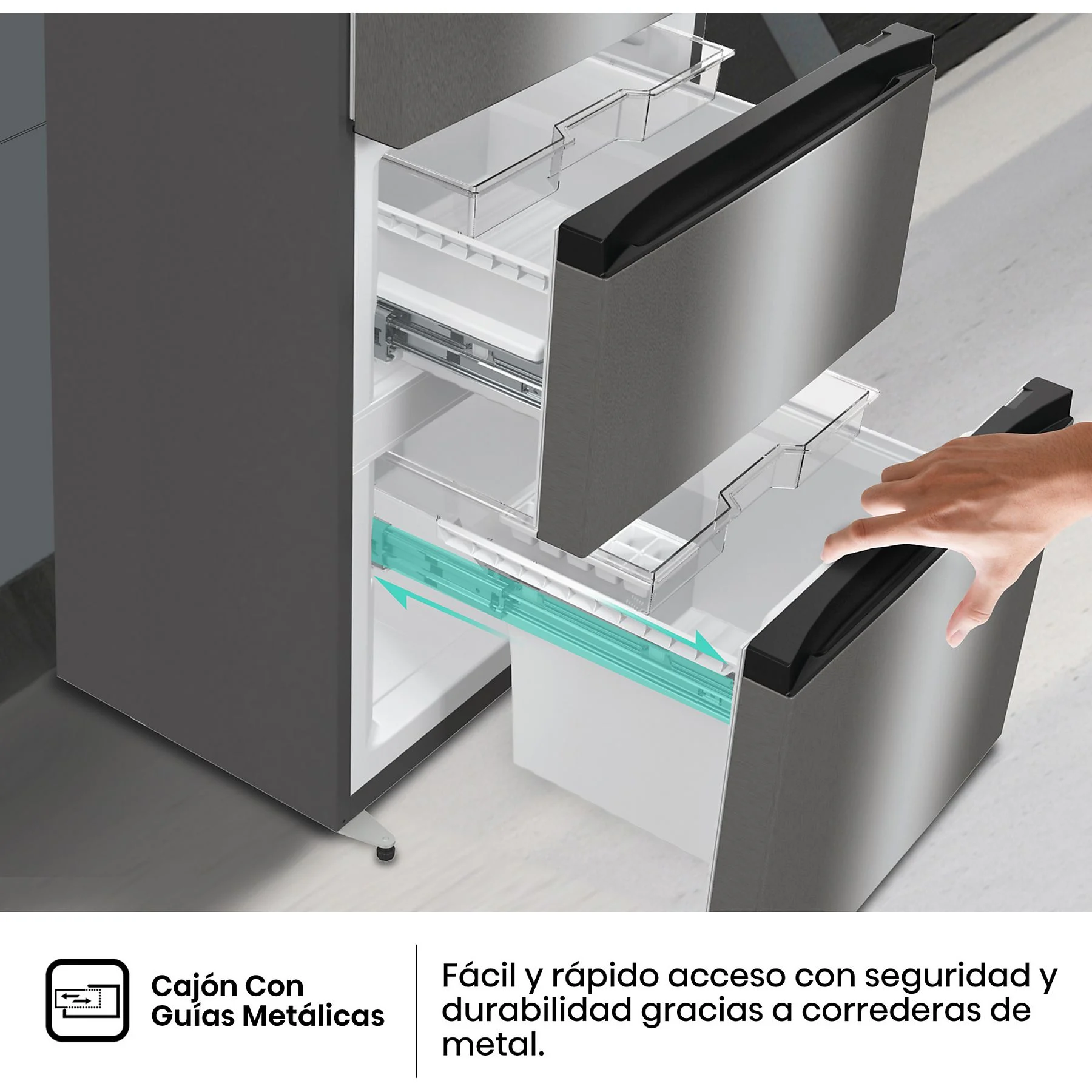 • Guías Metálicas: Los cajones están equipados con correderas de metal de alta durabilidad que garantizan un deslizamiento suave, rápido y seguro, incluso cuando están al máximo de su capacidad.