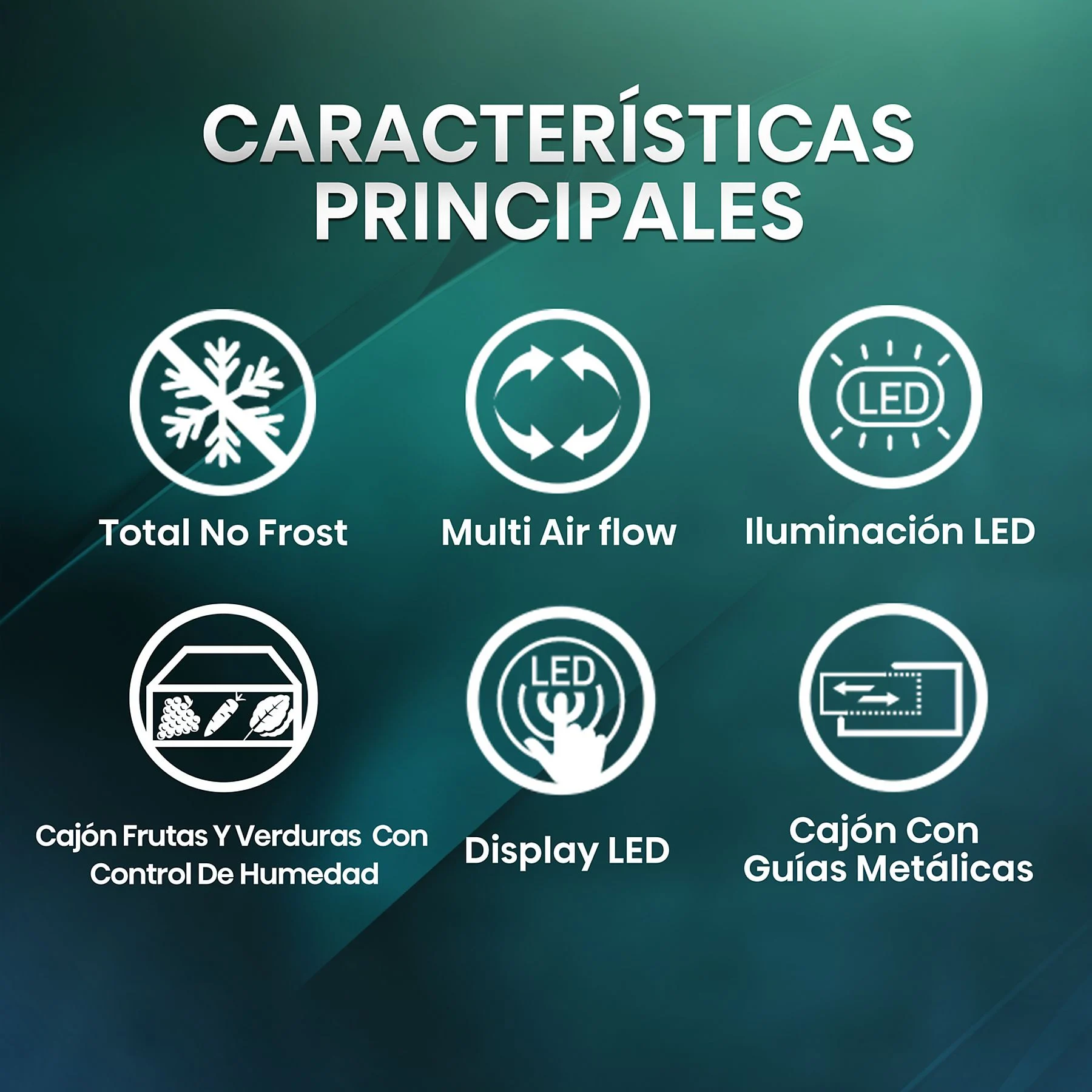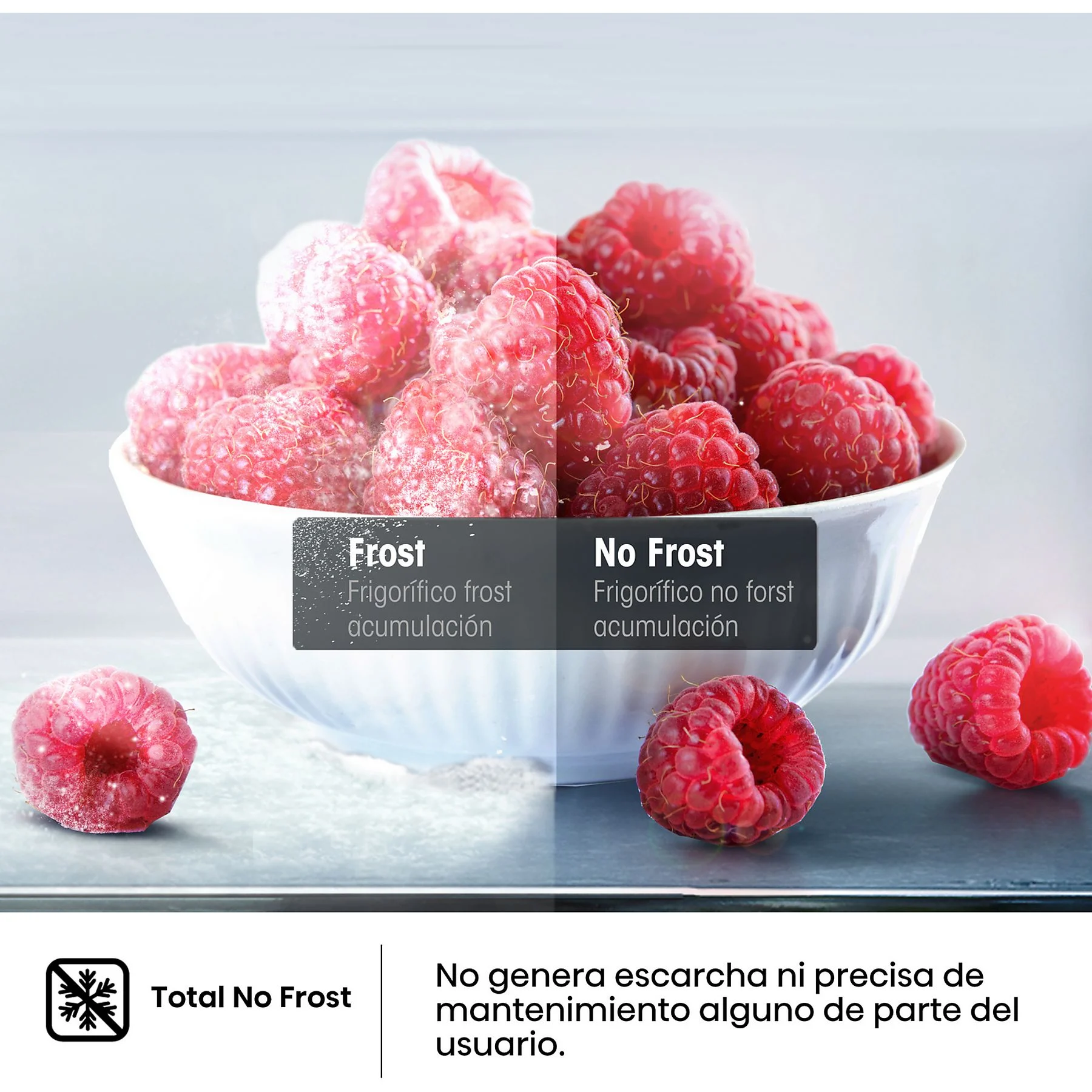 • Total No Frost: Olvídate de la escarcha. Este sistema garantiza un interior limpio y libre de hielo, eliminando la necesidad de descongelación manual y manteniendo la eficiencia del motor constante.