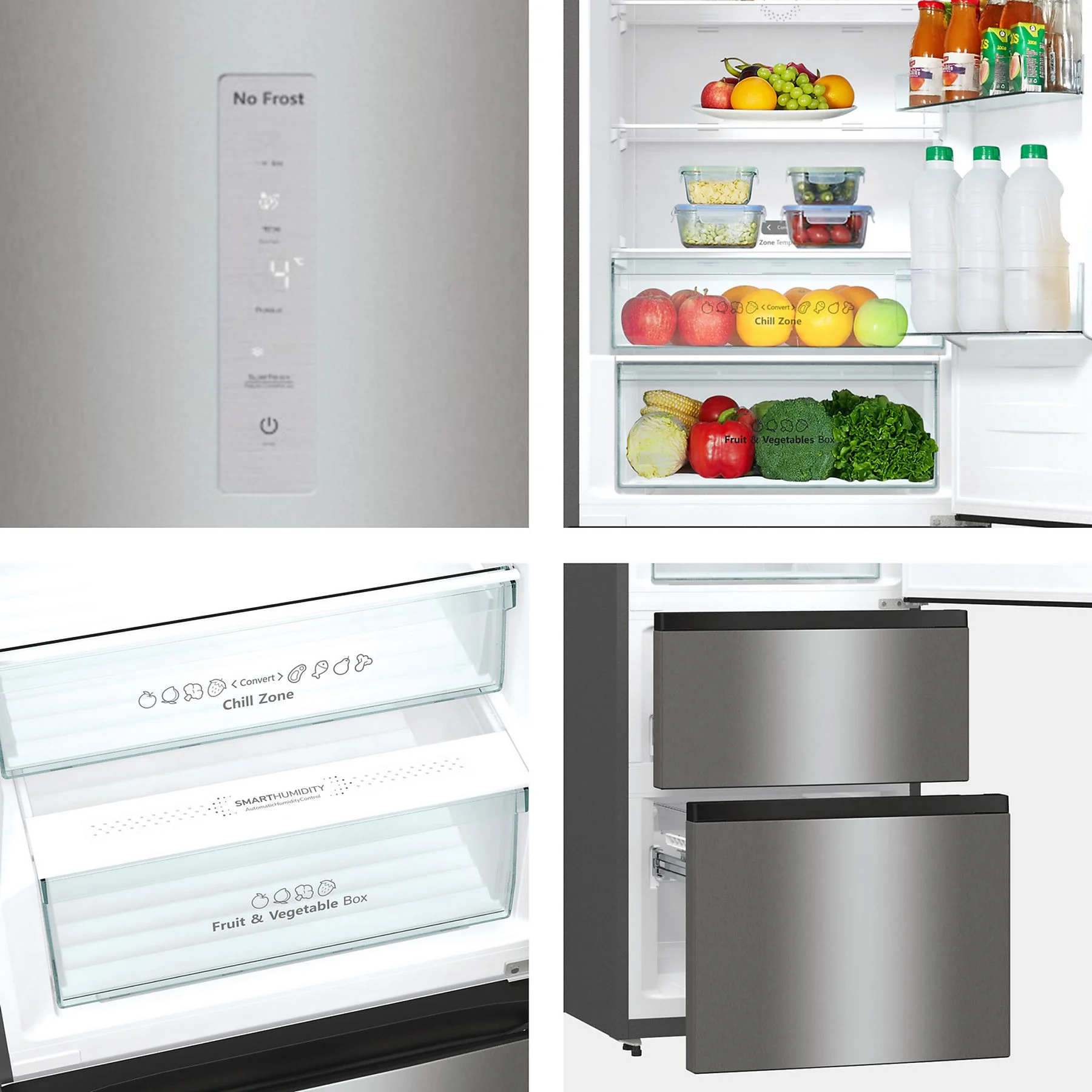 • Cajón de Frutas y Verduras: Un espacio dedicado que mantiene la humedad y temperatura ideal para preservar el aroma y la frescura de tus vegetales durante más tiempo.