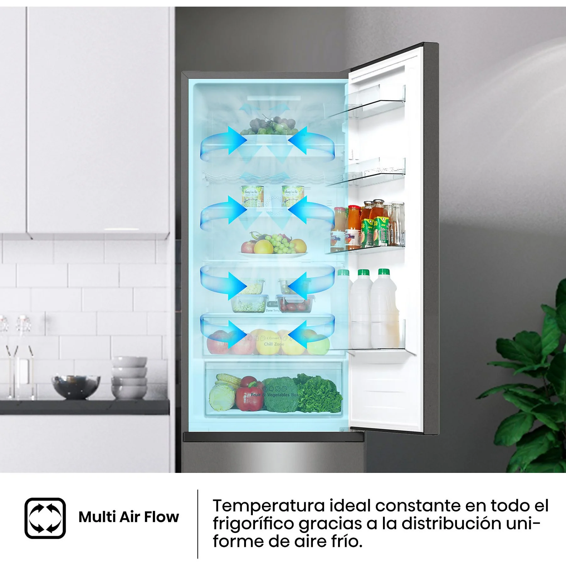 • Multi AirFlow: Distribuye el aire frío de manera uniforme en cada rincón del frigorífico (255 litros de zona de refrigeración), asegurando que la temperatura sea óptima en todos los estantes de vidrio templado.