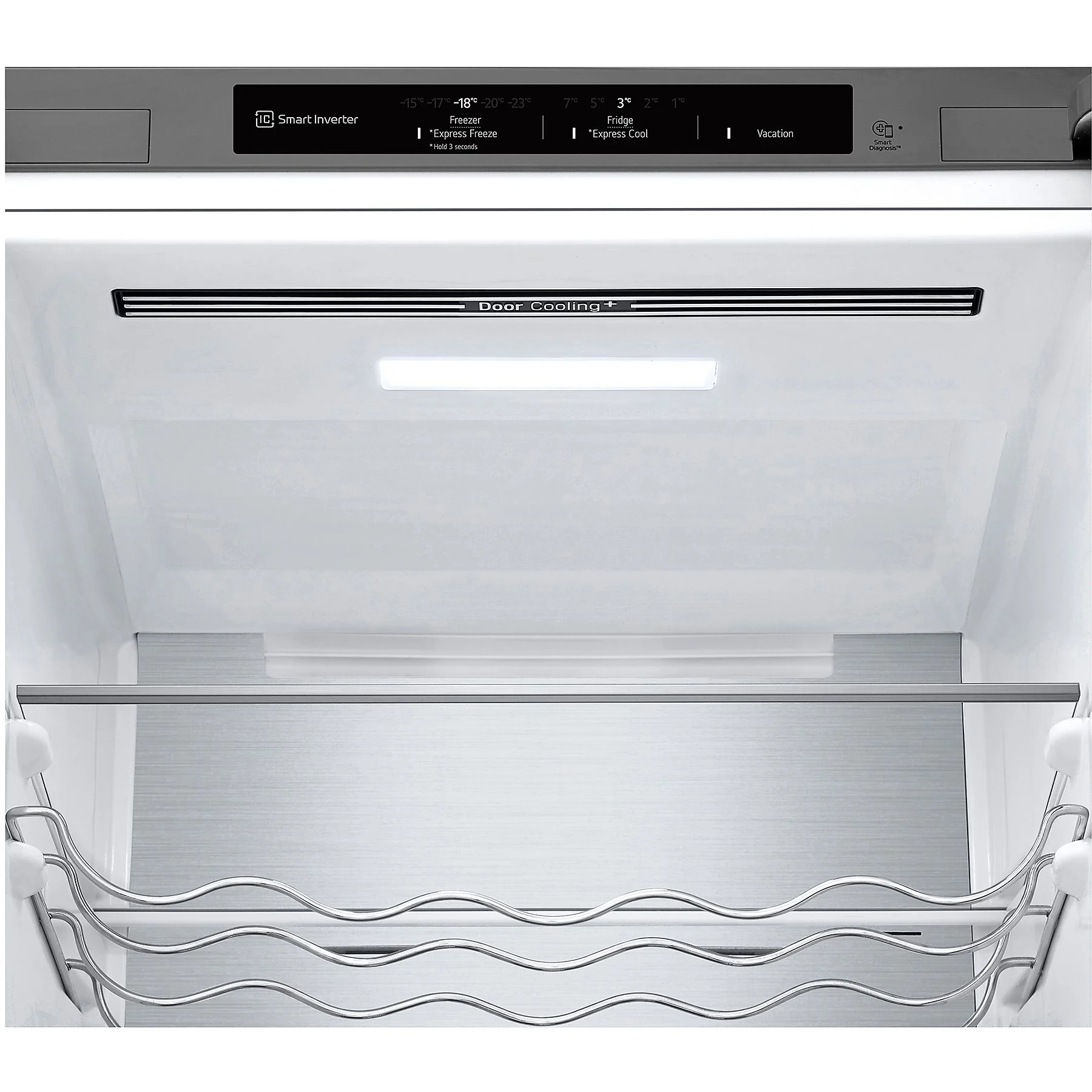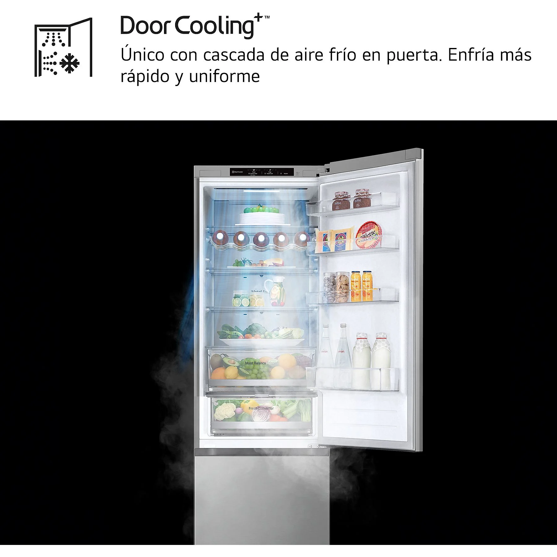 • DoorCooling+™: El único sistema con una salida de aire en forma de cascada en la parte superior frontal. Esto permite enfriar de manera más rápida y uniforme, reduciendo la diferencia de temperatura entre el interior y la puerta para proteger mejor los alimentos delicados.