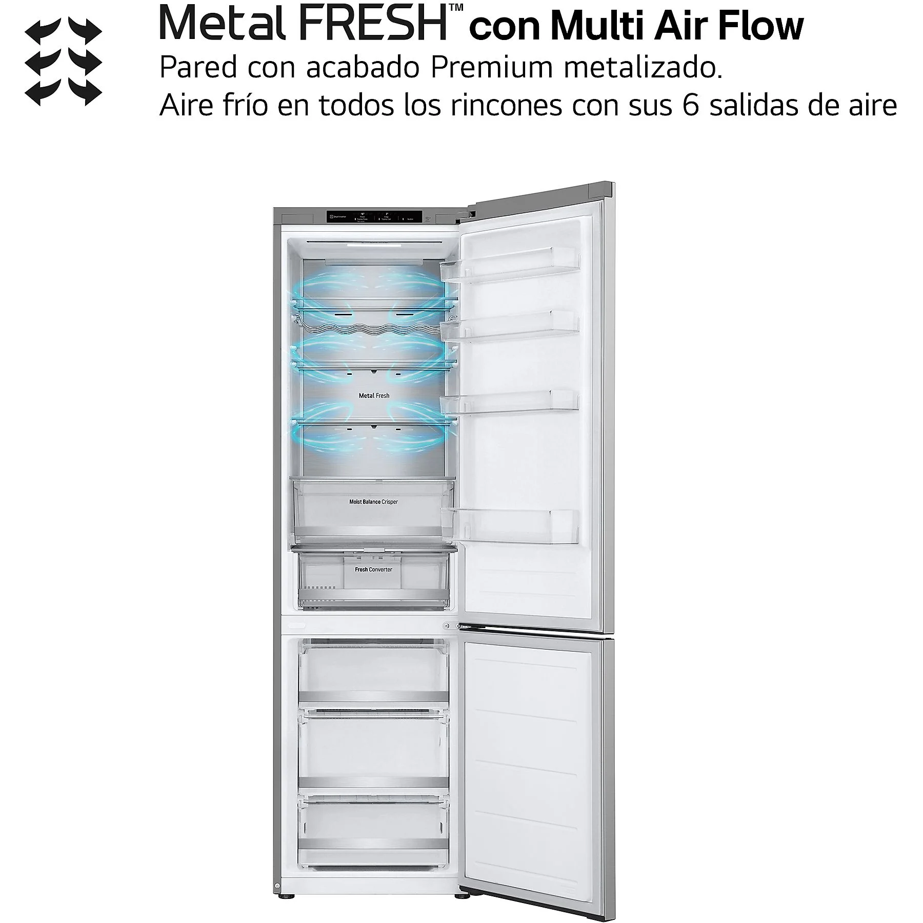 • Multi Air Flow: Múltiples salidas de aire distribuyen el frío de forma constante en todas las direcciones, asegurando que cada estante reciba la misma intensidad de refrigeración y manteniendo la humedad óptima.