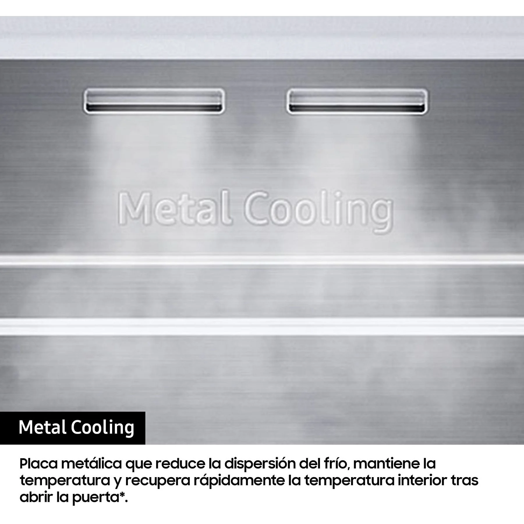 Metal Cooling: Una placa metálica ubicada en el fondo del frigorífico retiene el frío de forma excepcional. Esto ayuda a recuperar la temperatura interior rápidamente tras abrir la puerta, minimizando la pérdida térmica y protegiendo los alimentos más sensibles.