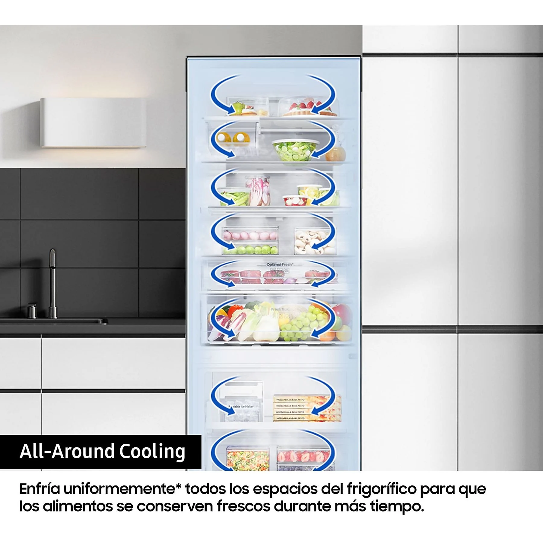 All-Around Cooling: Múltiples salidas de aire distribuyen el frío de manera constante y homogénea por cada estante. Esta circulación garantiza que no existan puntos calientes y que la temperatura sea siempre la misma en todo el interior.