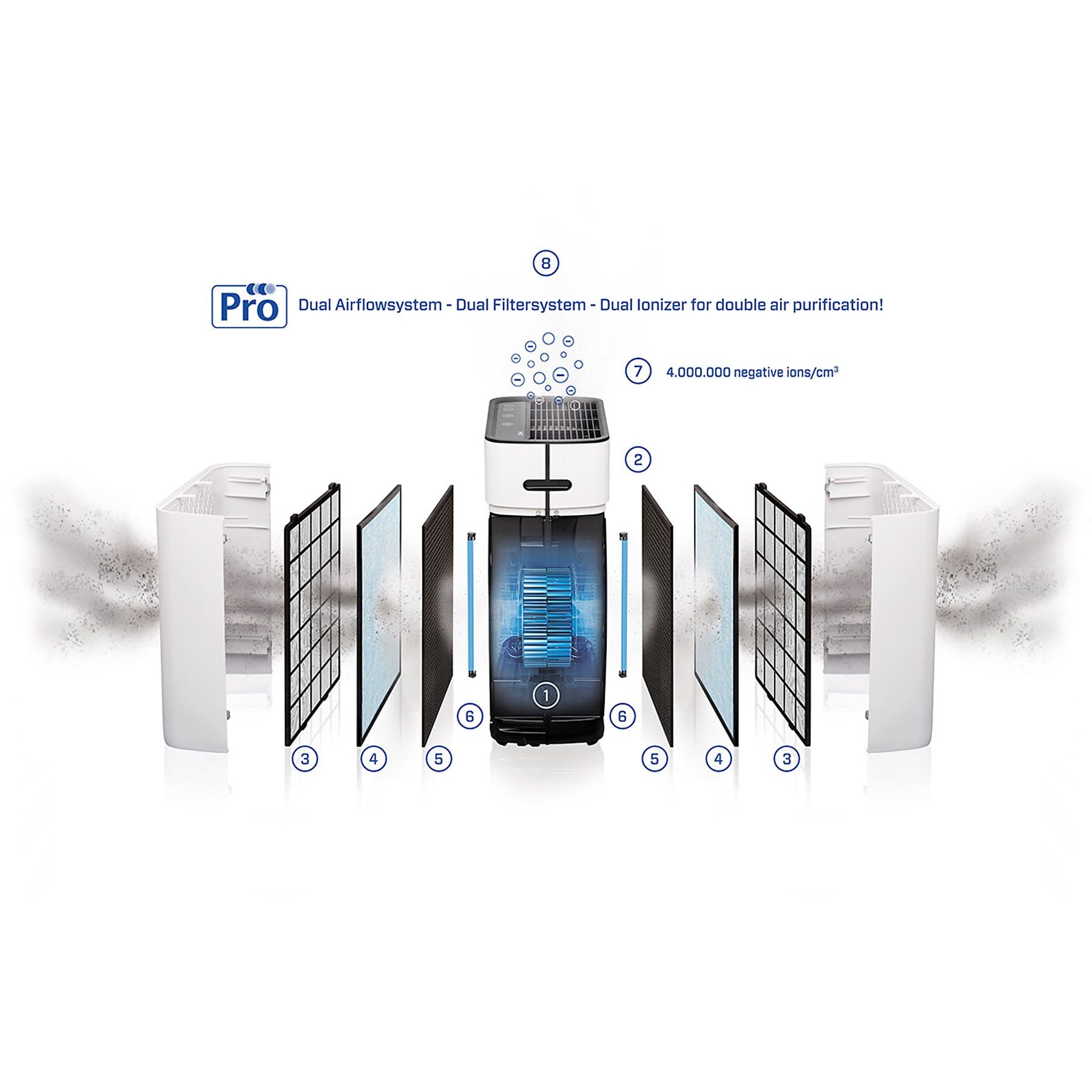 Doble Filtro de Carbón Activo: Diseñado para la eliminación total de la contaminación gaseosa. Es extremadamente eficaz filtrando olores de cocina, productos químicos domésticos, humos de cigarrillo y COV (Compuestos Orgánicos Volátiles), garantizando un aire fresco y neutro.