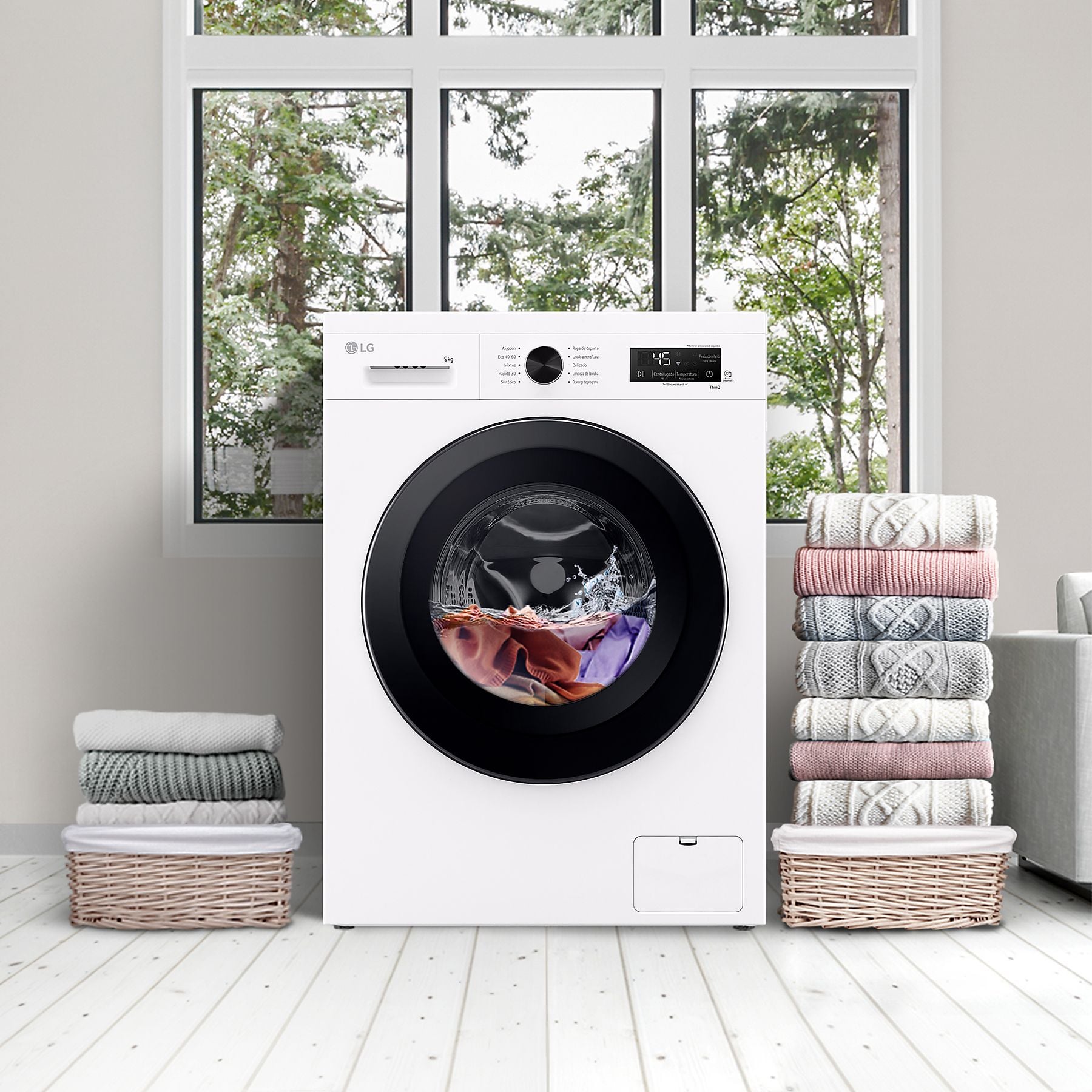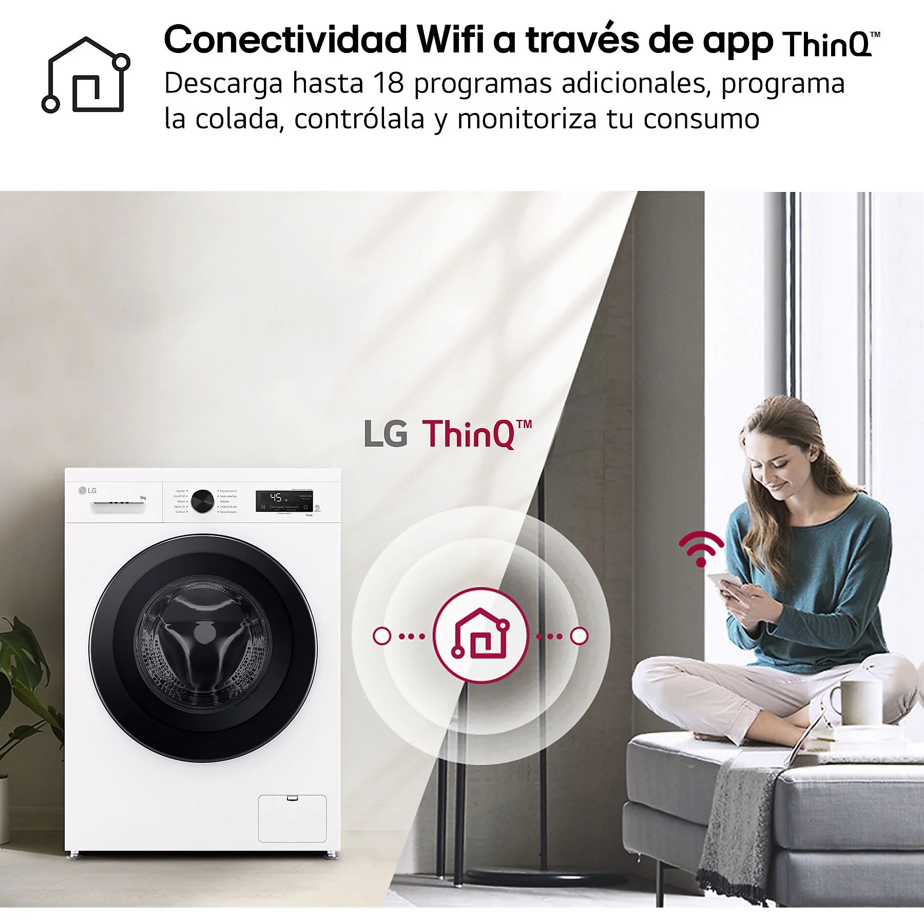 Control Remoto vía Wi-Fi: Gracias a la aplicación ThinQ™, puedes poner en marcha la lavadora desde tu smartphone, monitorizar el consumo de energía o descargar ciclos de lavado adicionales que no vienen por defecto.