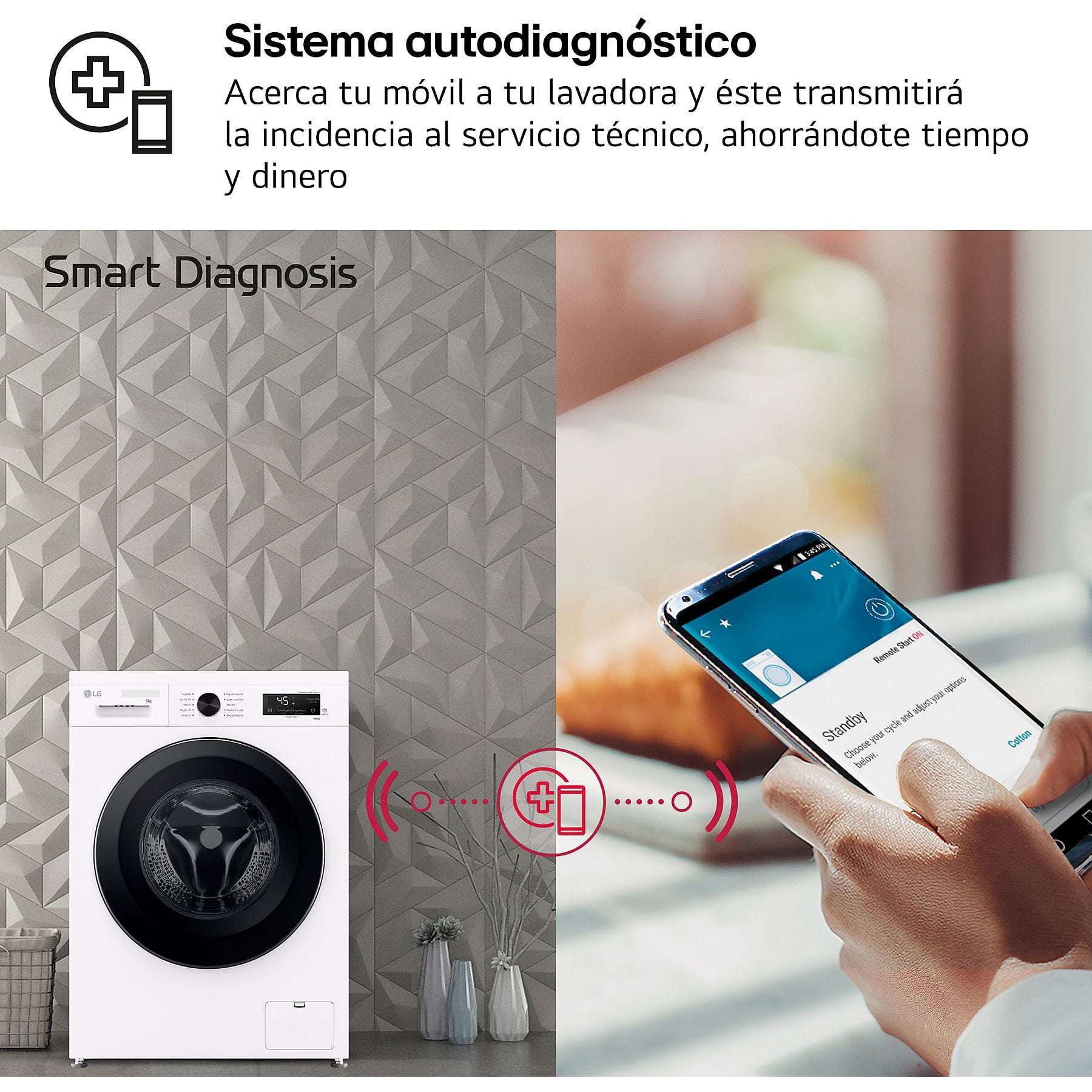 Smart Diagnosis: Si surge algún inconveniente, basta con acercar tu móvil a la lavadora; el sistema de autodiagnóstico transmitirá la incidencia directamente al servicio técnico, ahorrándote visitas innecesarias y tiempo.