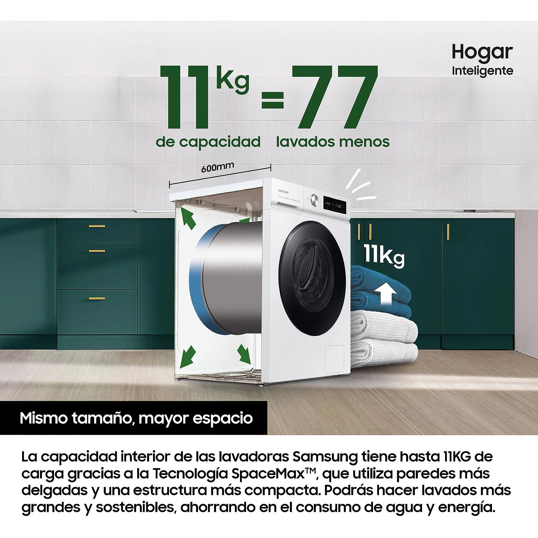 Lavadora inteligente con capacidad XXL de 11 kg y eficiencia revolucionaria A-40%. Incluye autodosificación de detergente, tecnología QuickDrive™ para lavar en la mitad de tiempo y conectividad Wi-Fi con SmartThings.