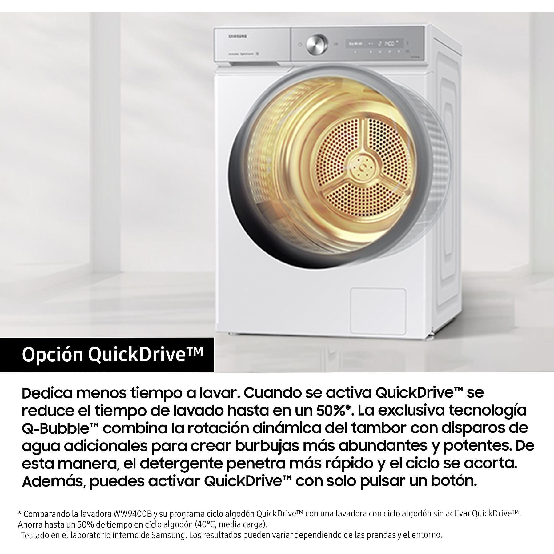 • Rapidez sin compromiso: La tecnología QuickDrive™ reduce el tiempo de lavado hasta en un 50%. Su sistema Q-Bubble™ combina una rotación dinámica del tambor con disparos de agua para crear burbujas más potentes que penetran instantáneamente en la ropa.