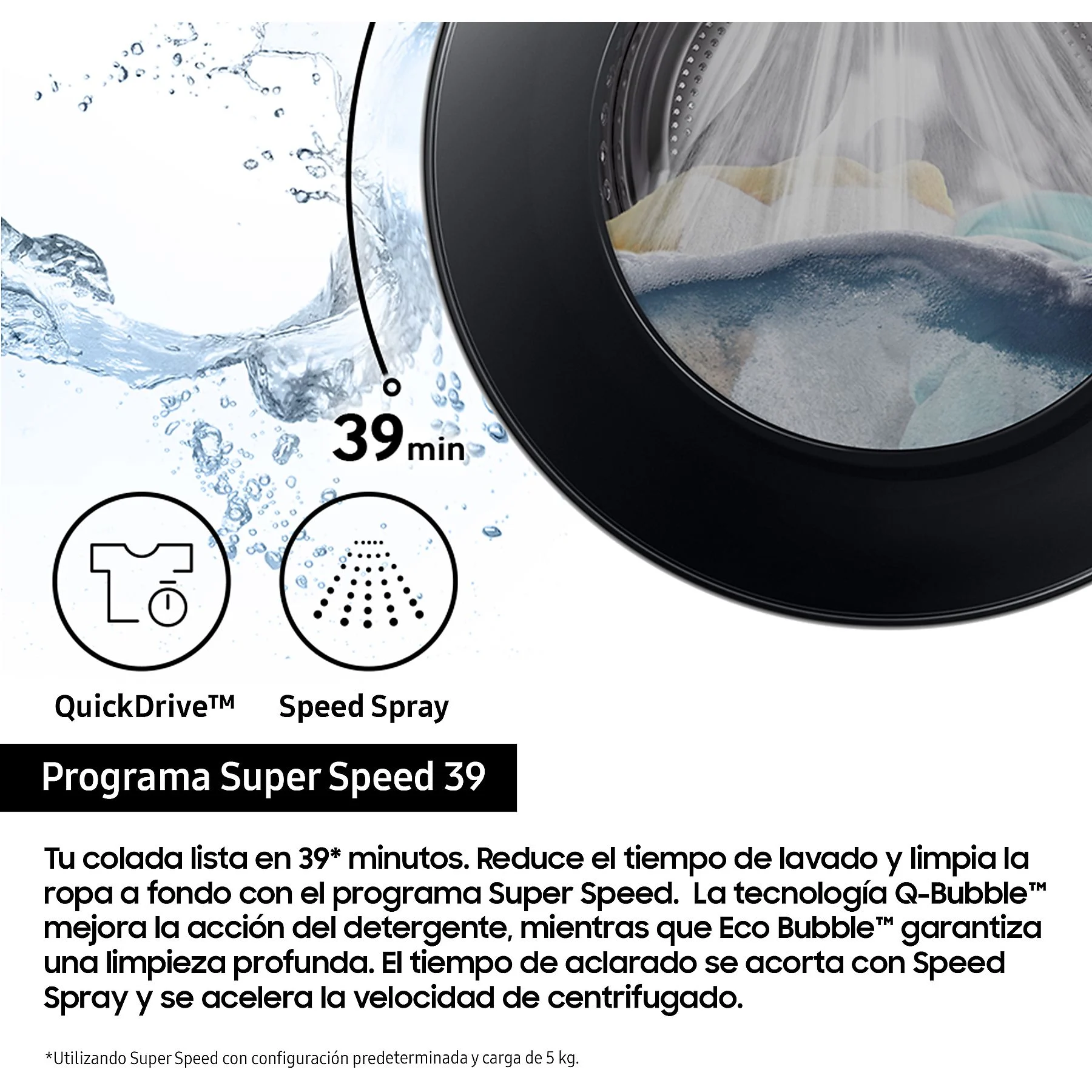 Super Speed 39′: No sacrifiques limpieza por falta de tiempo. Gracias a las tecnologías Q-Bubble™ y un potente spray de agua (Speed Spray), puedes tener una carga de 5 kg lista y perfectamente limpia en solo 39 minutos.