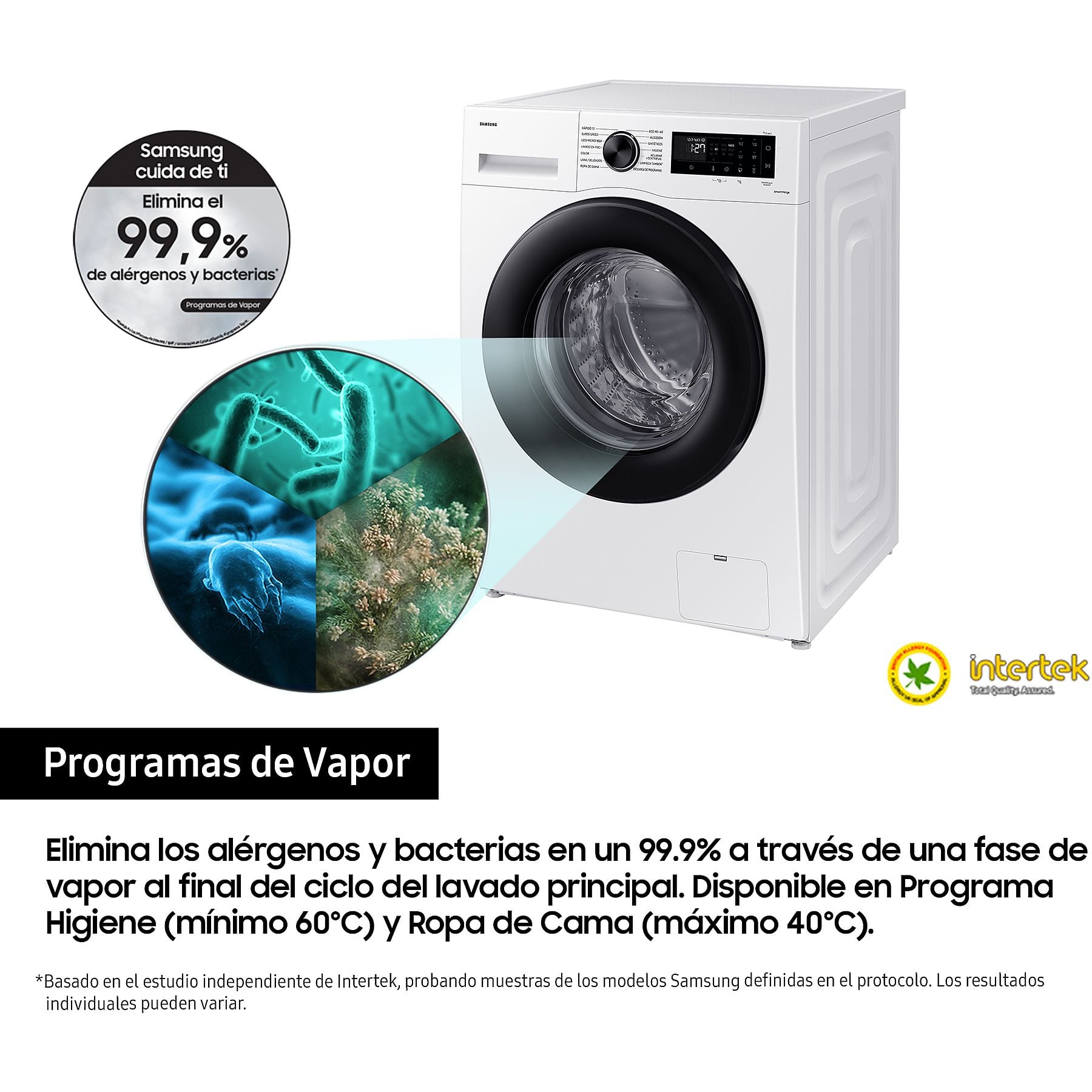 Higiene con Vapor: Elimina el 99,9% de bacterias y alérgenos domésticos. Al final del ciclo, una fase de vapor penetra en las fibras para desinfectar profundamente la ropa de cama y las prendas de los más pequeños.