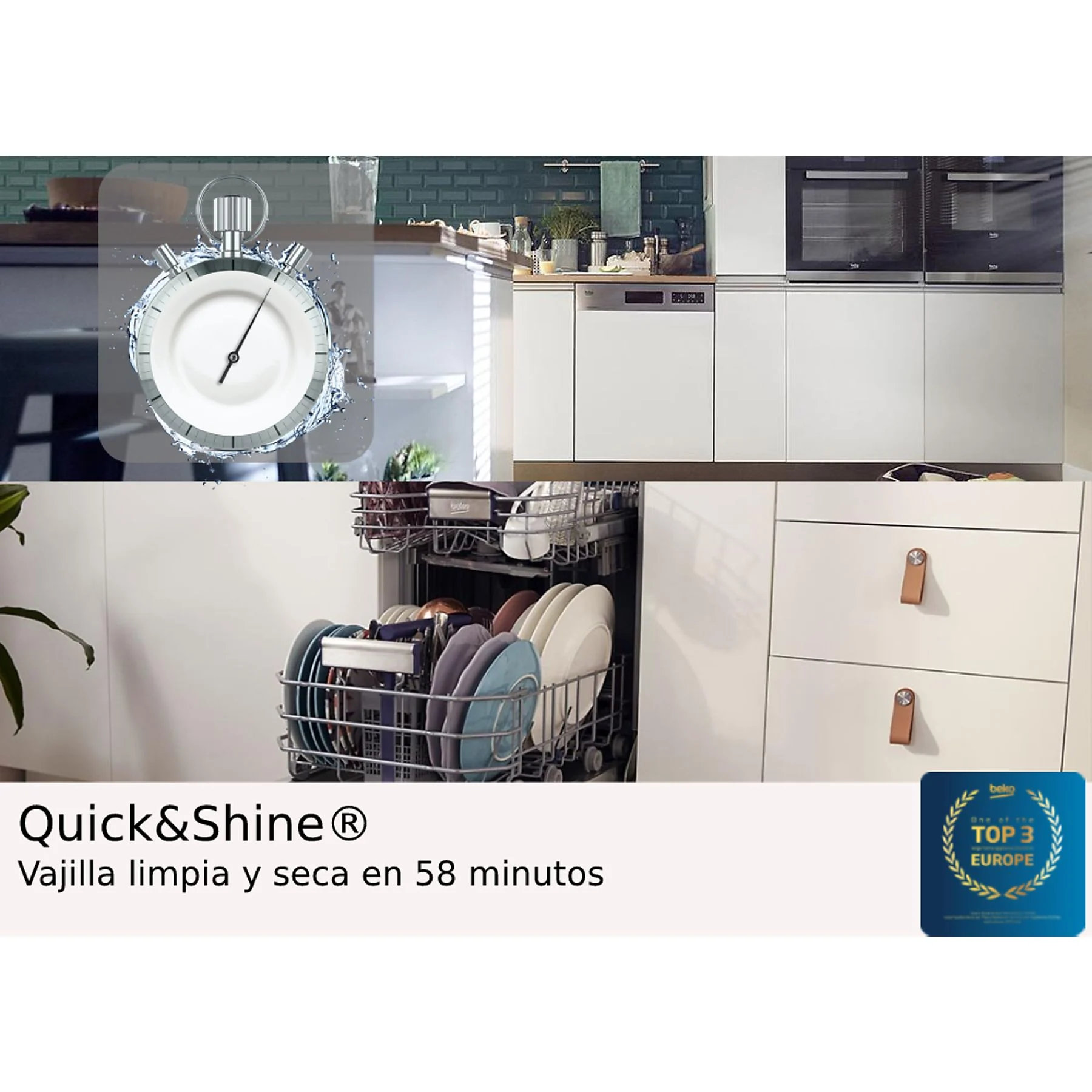 6 Programas Especializados: Incluye el modo Auto (que ajusta el lavado según la suciedad), Intensivo a 70°C, Eco y el programa Quick&Shine para una vajilla reluciente en poco tiempo.