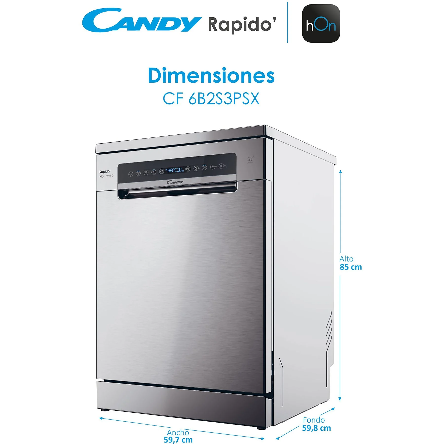 Lavavajillas Candy RapidÓ CF 6B2S3PSX | 16 servicios, 60 cm, Motor Inverter, Power Wash, Wi-Fi – Acero Inoxidable