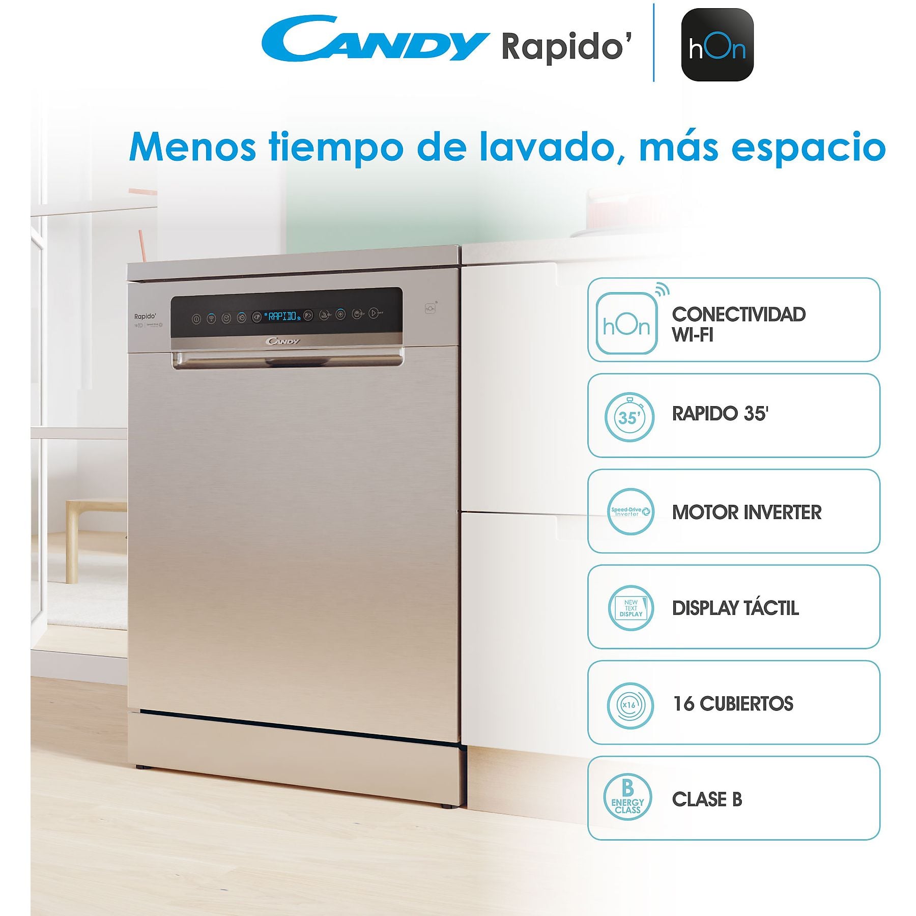 Ciclo Rápido 35′: El Candy RapidÓ ofrece el ciclo de lavado y secado de carga completa más veloz del mercado. Tendrás toda tu vajilla lista en poco más de media hora, ideal para el ritmo de vida actual.
