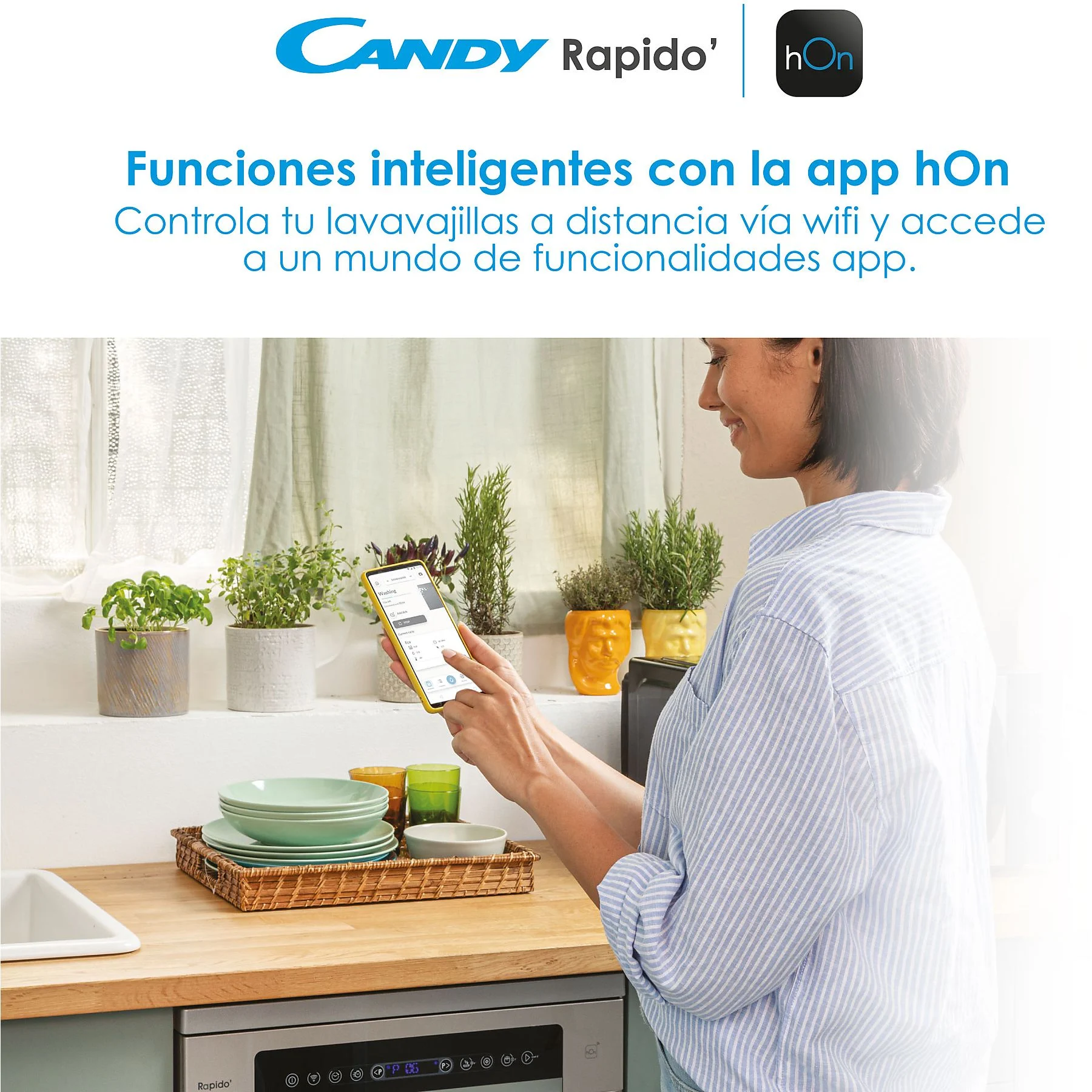 App hOn y Wi-Fi: Controla tu lavavajillas desde cualquier lugar. Recibe consejos sobre el mejor ciclo a utilizar, monitoriza el consumo o descarga programas adicionales que se adapten a tus necesidades específicas.
