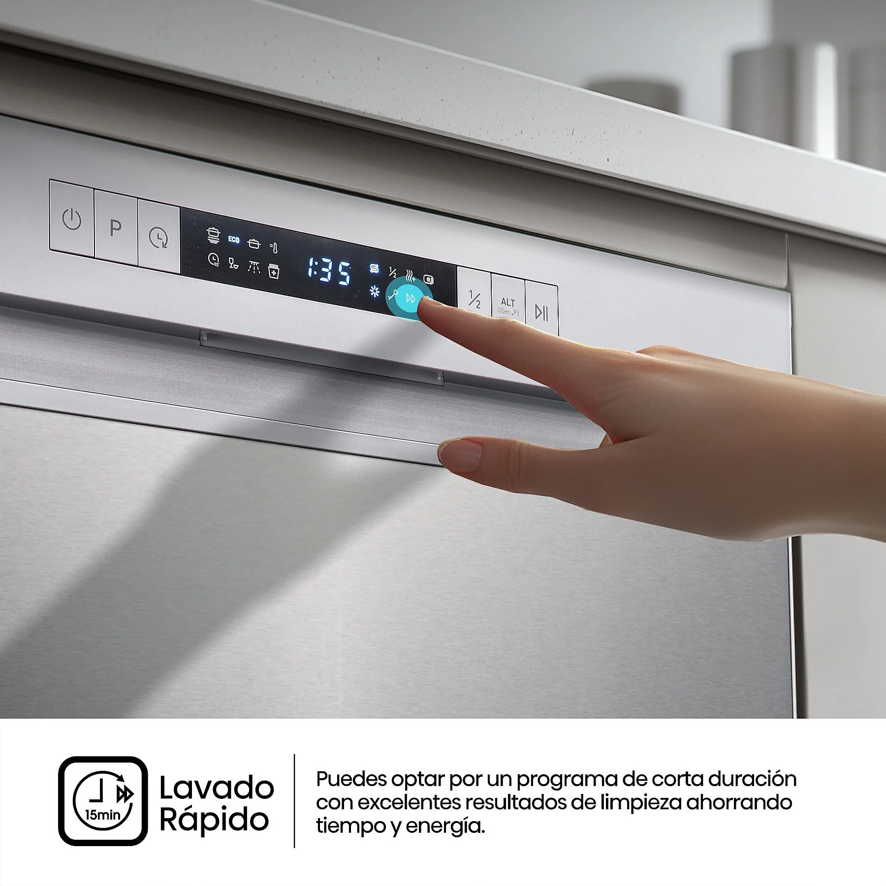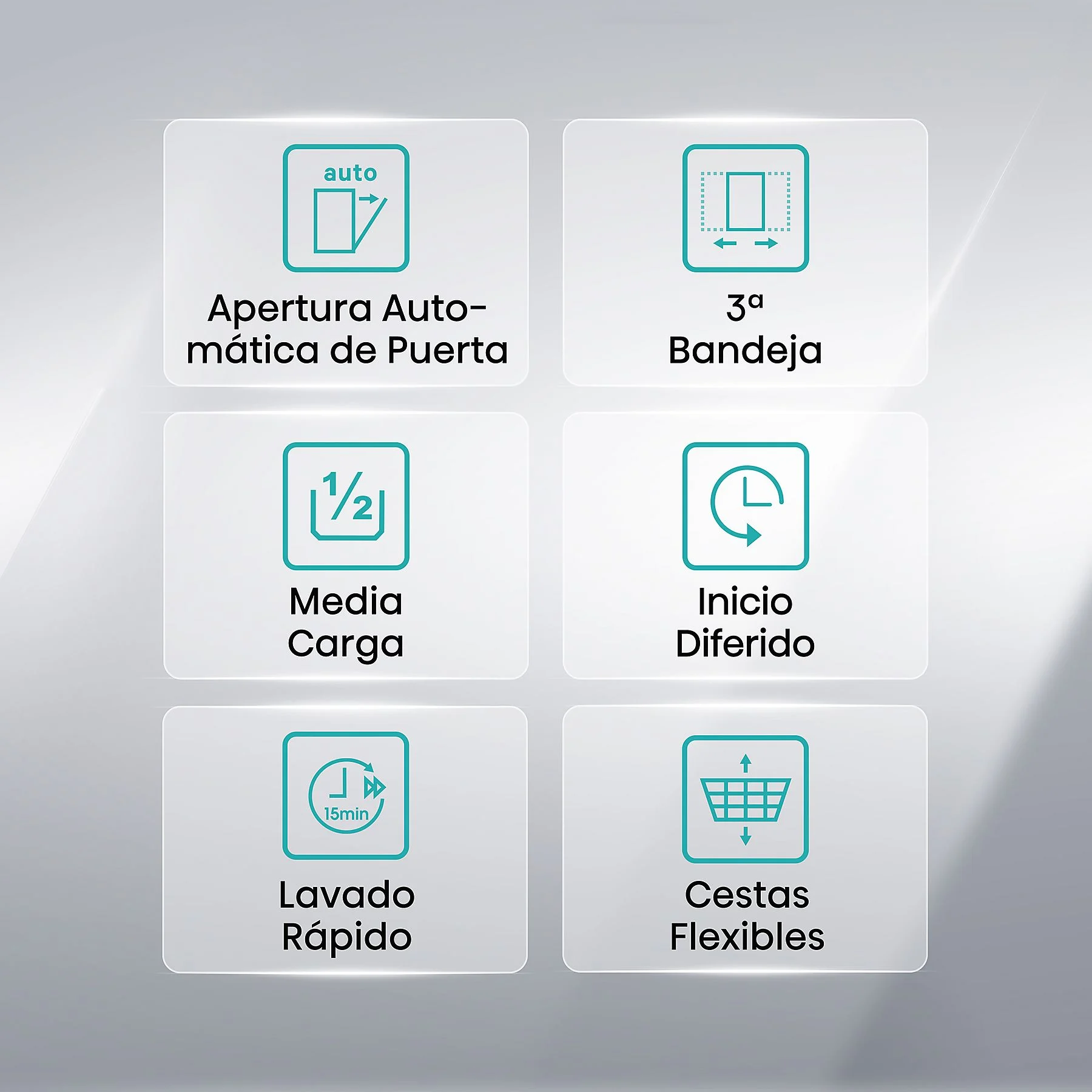 Eficiencia y gran capacidad de 14 servicios con un elegante acabado en acero inoxidable. Destaca por su sistema de apertura automática para un secado perfecto y una tercera bandeja flexible que maximiza el espacio interior.