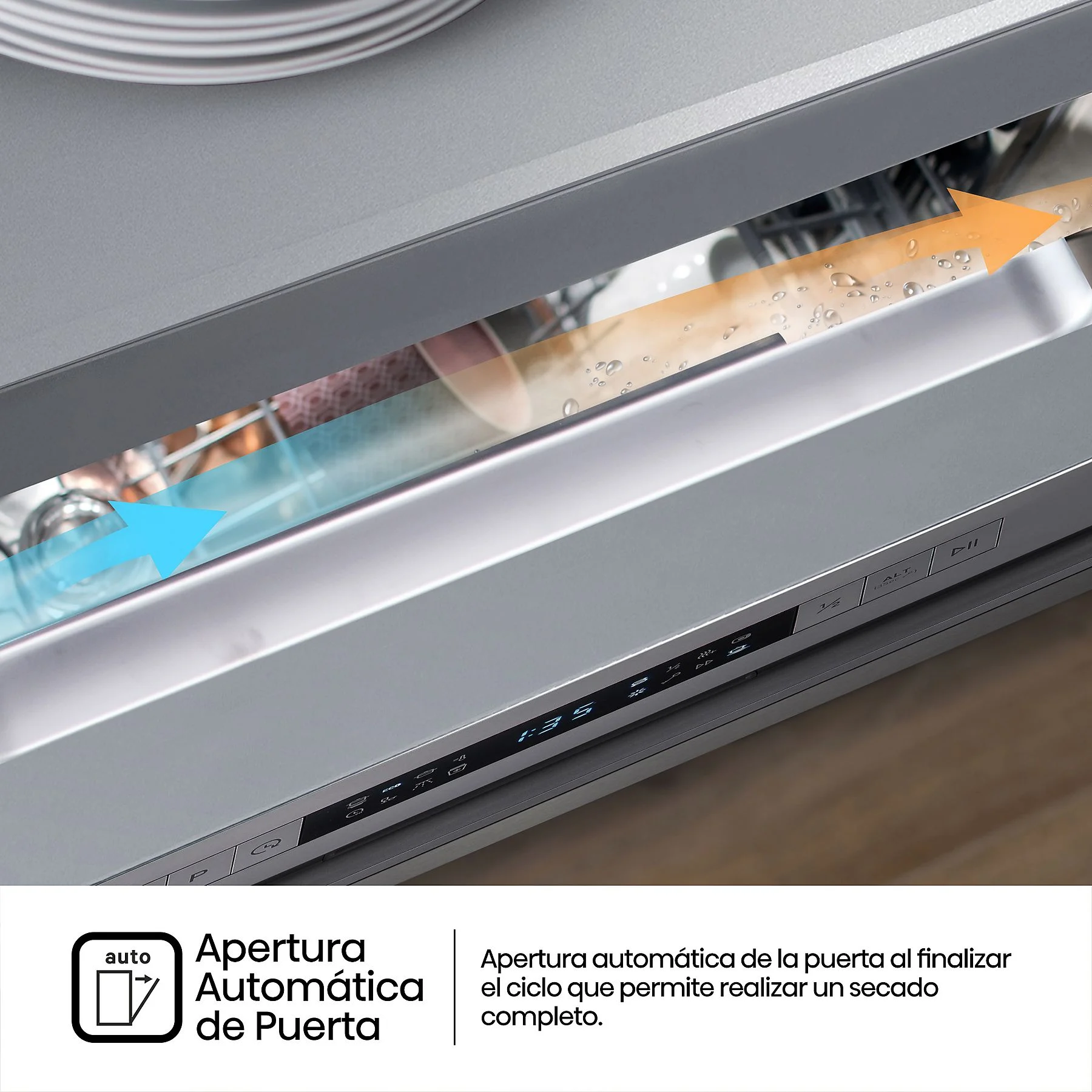 Auto Dry: Al finalizar el ciclo de lavado, la puerta se abre automáticamente unos centímetros. Esto permite que el vapor salga y el aire fresco circule, garantizando que incluso la vajilla de plástico salga completamente seca y lista para guardar.