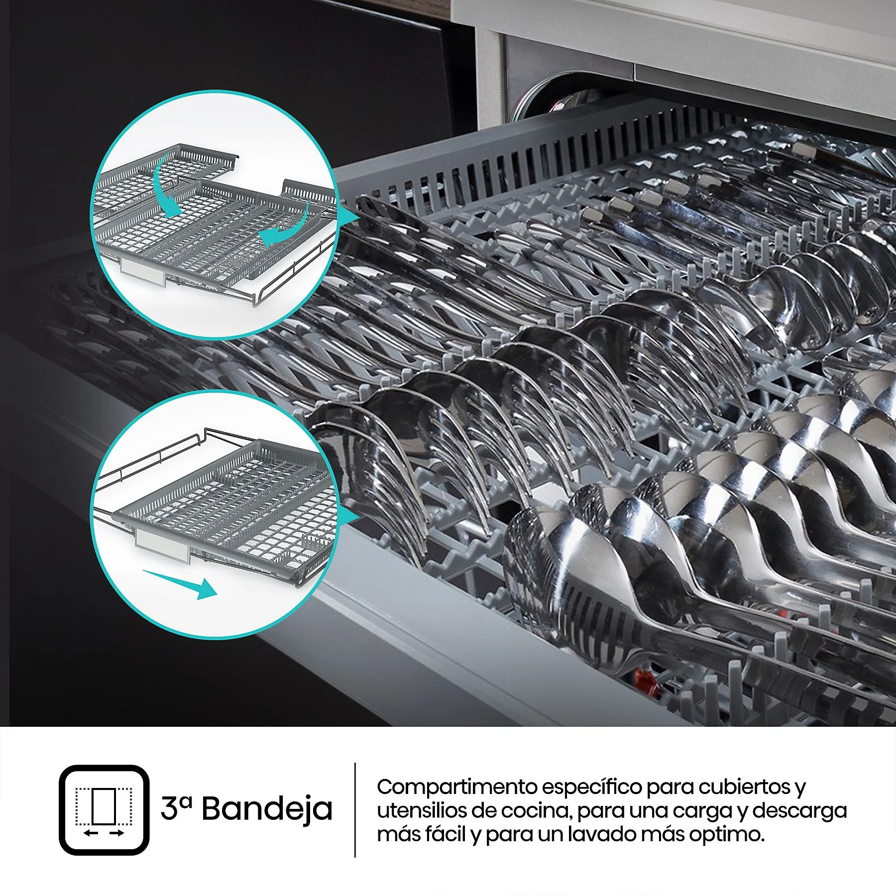 Tercera Bandeja Flexible: Ubicada en la parte superior, esta cesta dedicada a los cubiertos es completamente adaptable, liberando espacio en las cestas inferiores para platos y fuentes de gran tamaño.