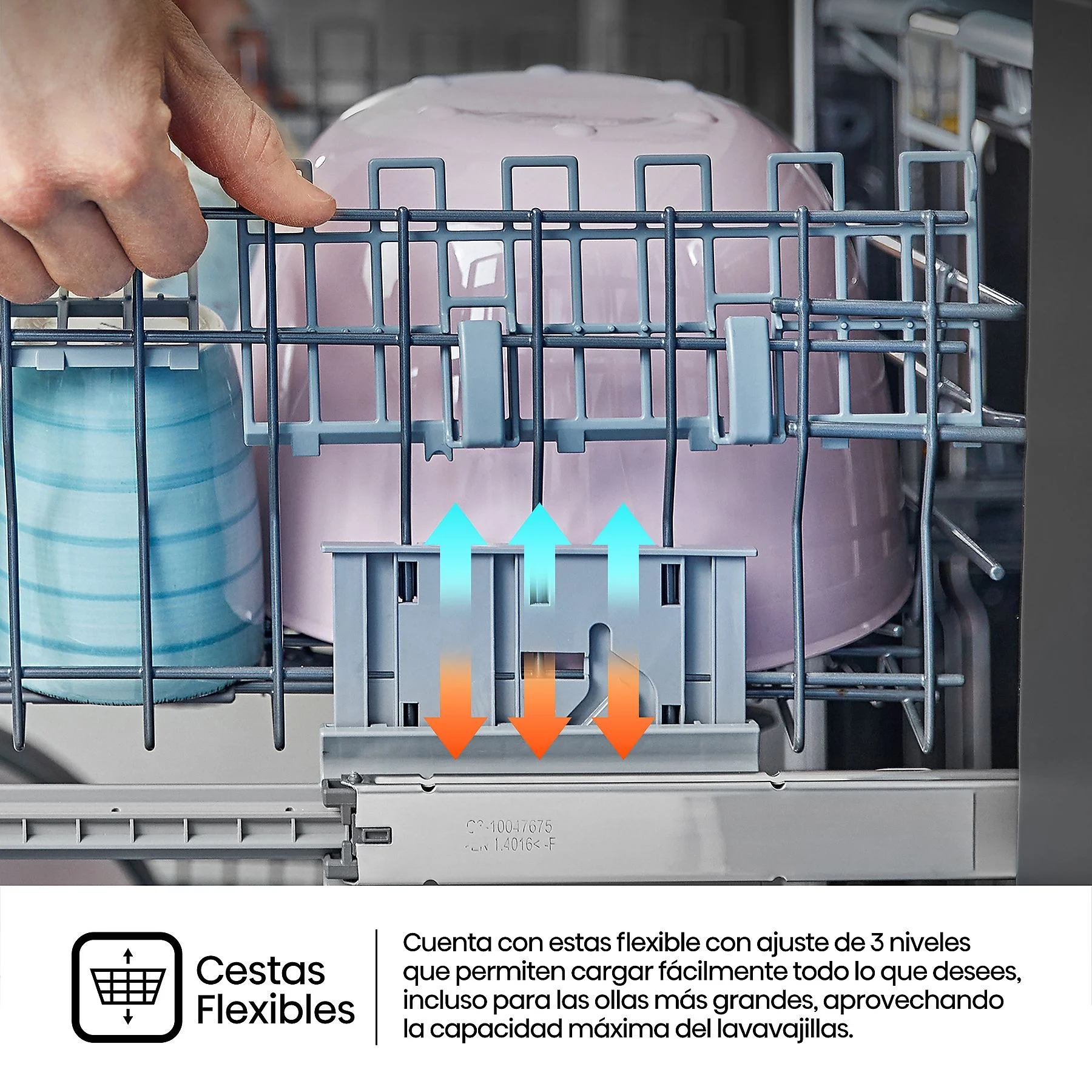 Cestas Flexibles de 3 niveles: El sistema de ajuste permite configurar el interior en tres niveles diferentes, facilitando la carga de piezas voluminosas como ollas grandes o bandejas de horno.