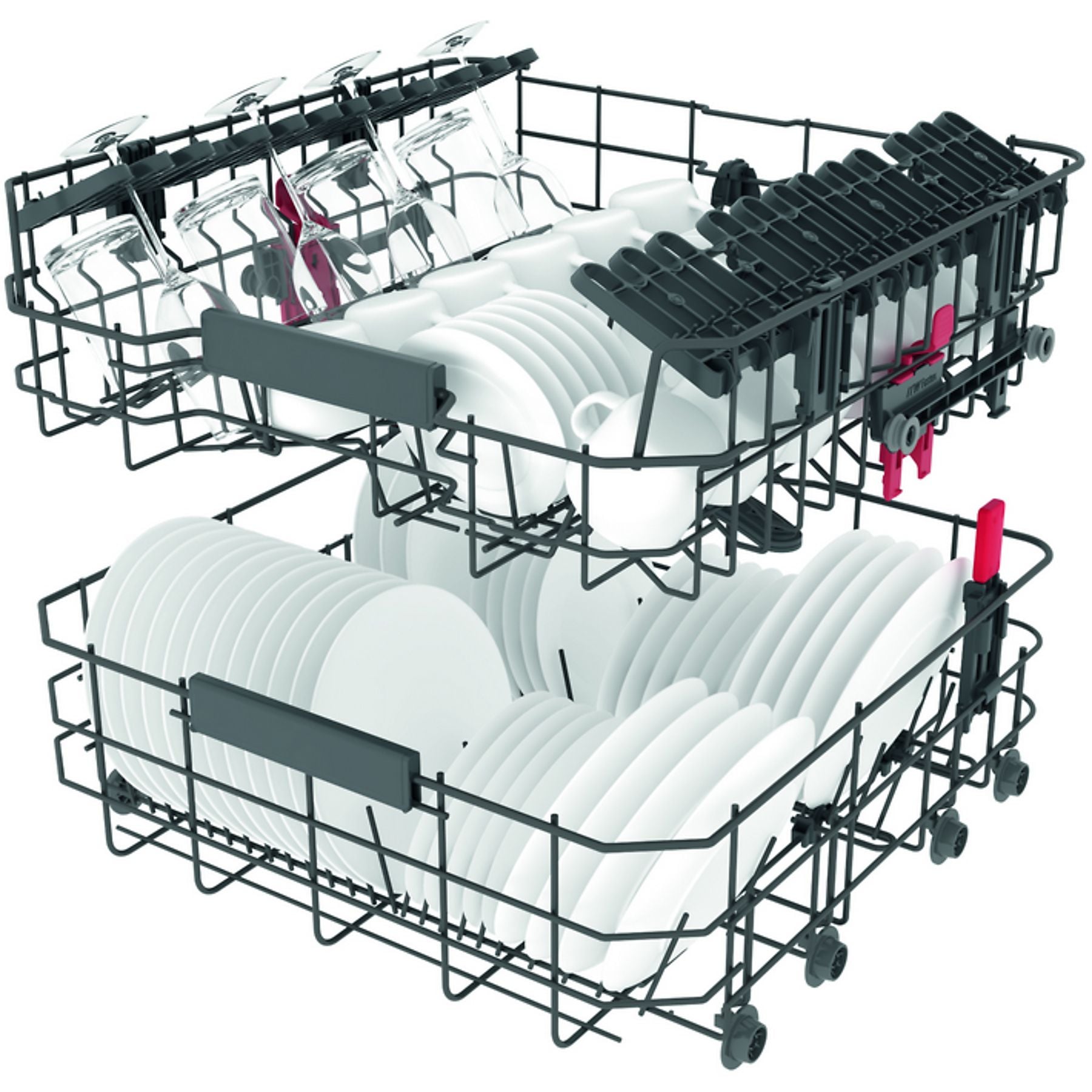 14 Servicios y Tercera Bandeja: Espacio optimizado para familias grandes. La tercera bandeja dedicada para cubiertos y utensilios pequeños libera espacio en las cestas principales, facilitando una organización mucho más eficiente.