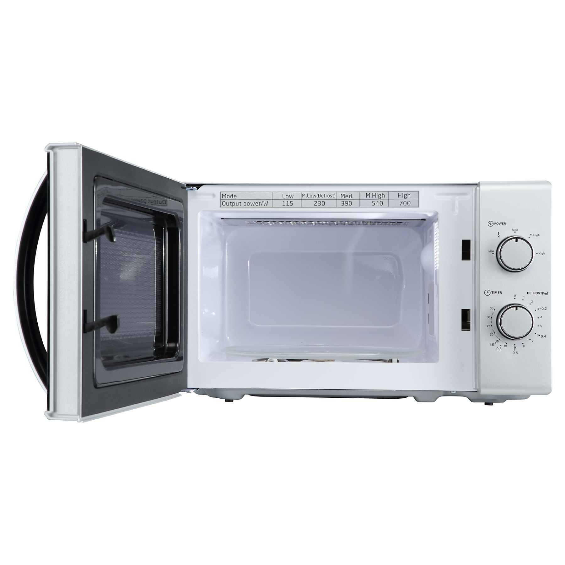 Su funcionamiento destaca por ser extremadamente intuitivo: gracias a sus dos mandos giratorios mecánicos, puedes seleccionar la potencia y el tiempo (hasta 35 minutos) de forma rápida y sin complicaciones digitales. Cuenta con 700 W de potencia repartidos en 5 niveles diferentes, lo que permite desde un calentamiento rápido hasta una función de descongelación delicada, asegurando que los alimentos mantengan su textura original.