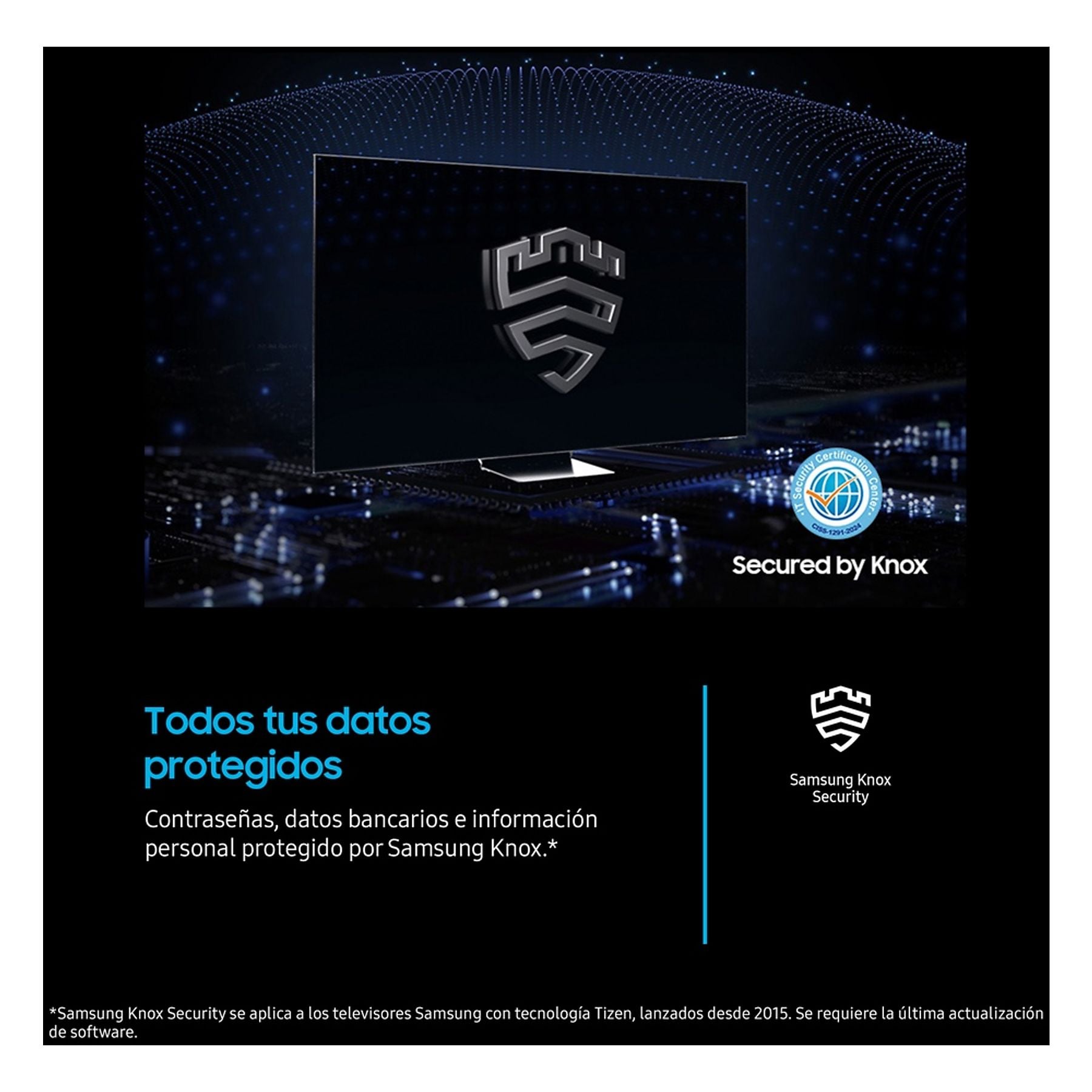 Este modelo destaca por sus funciones inteligentes y de seguridad. Equipado con el sistema operativo Tizen, ofrece acceso a Samsung TV Plus con más de 150 canales gratuitos y permite controlar el hogar conectado a través de SmartThings. Una característica innovadora es la compatibilidad con Galaxy Watch, que permite manejar la TV mediante gestos intuitivos. Todo este ecosistema está protegido por Samsung Knox Security, garantizando que tus datos personales y contraseñas permanezcan cifrados y seguros.