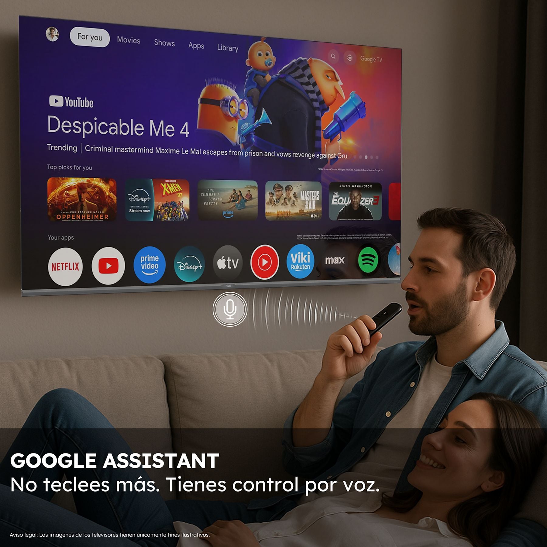 Smart TV: Sistema Google TV con control por voz y acceso a miles de aplicaciones.
