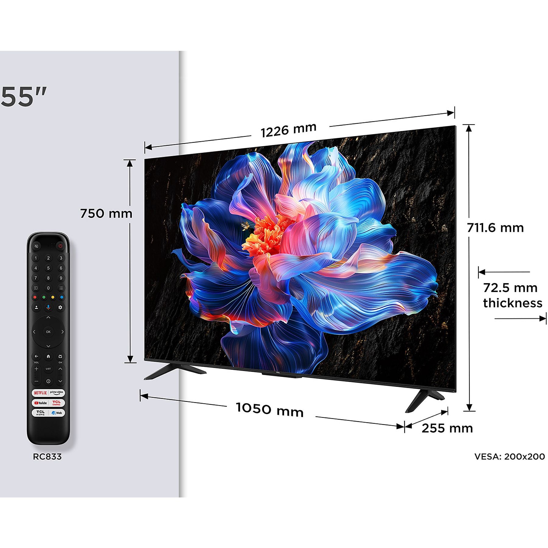 Tecnología de Pantalla: Panel LCD de 55″ (140 cm) con resolución UHD 4K (3840×2160).