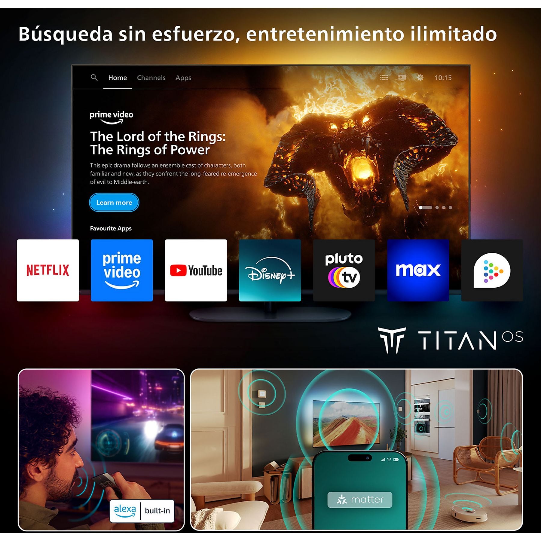 • Smart TV: Sistema Operativo Titan OS con control por voz y modo ecológico.